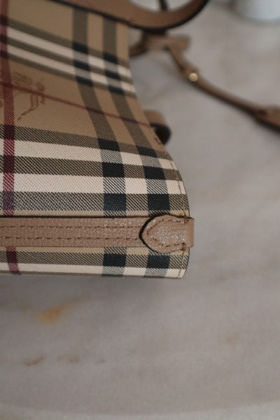 • Material: Beige Haymarket Check Coated Canvas with Leather Trim