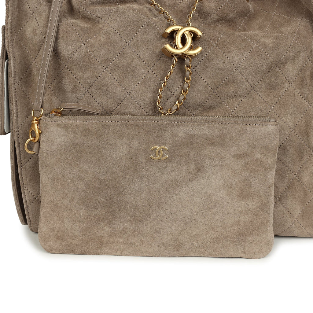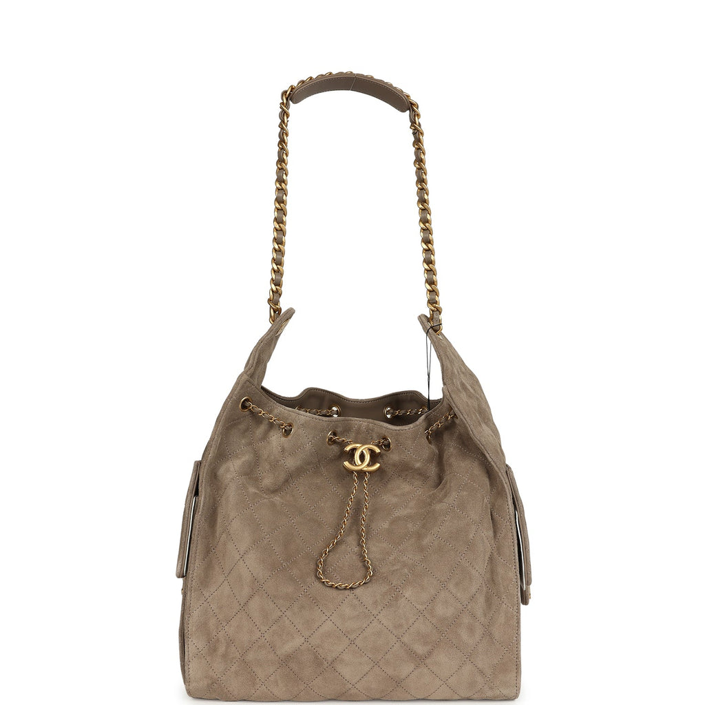 Chanel Medium 25 Hobo Bag Dark Grey Suede Antique Gold Hardware Shop for an authentic Chanel Medium 25 Hobo Bag in dark grey suede with antique gold hardware in new and never worn condition at Madison Avenue Couture.