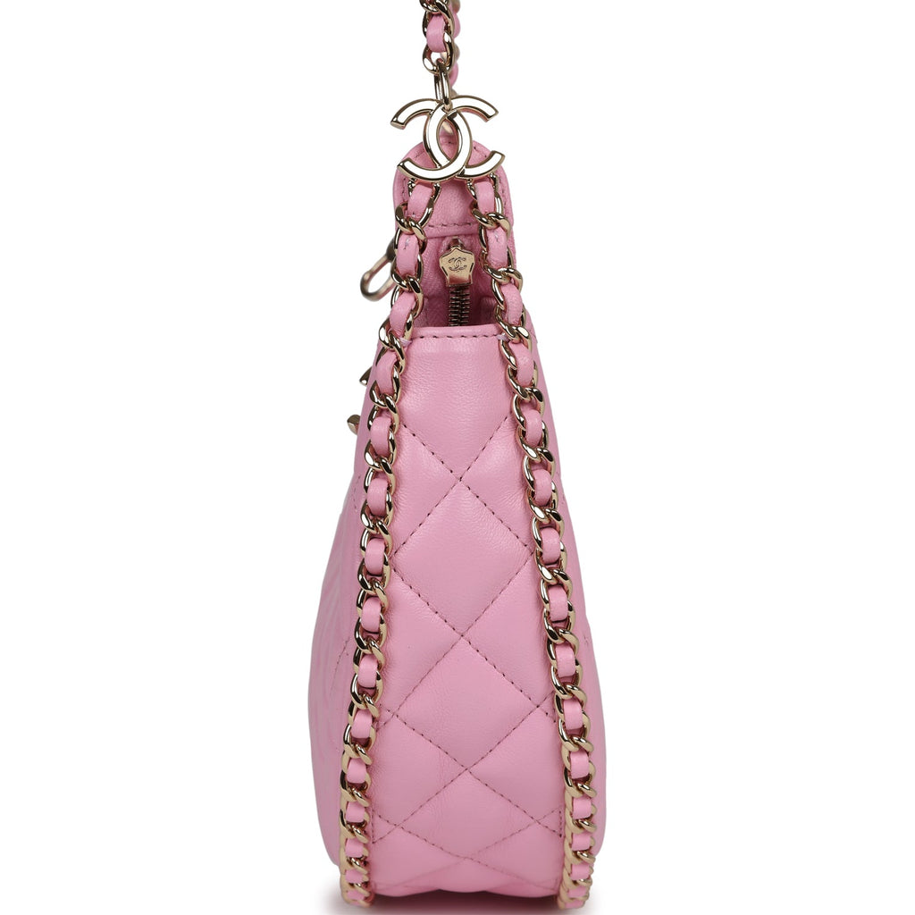 Chanel Small Chain Around Hobo Pink Lambskin Gold Hardware Shop for an authentic Chanel Chain Around Hobo Small Pink Lambskin bag with Gold Hardware in never worn condition at Madison Avenue Couture.