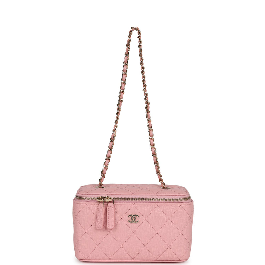 Chanel Small Classic Vanity Case Pink Caviar Light Gold Hardware Shop for an authentic Chanel Small Classic Vanity Case in pink caviar with light gold hardware in new and never worn condition at Madison Avenue Couture.