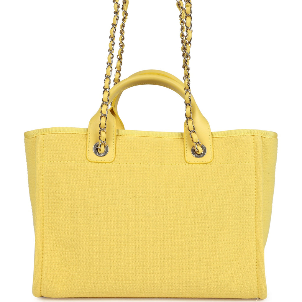 Chanel Small Deauville Shopping Tote Yellow Canvas Light Gold Hardware Shop for an authentic Chanel small Deauville shopping tote in yellow canvas with light gold tone hardware in new and never worn condition at Madison Avenue Couture.