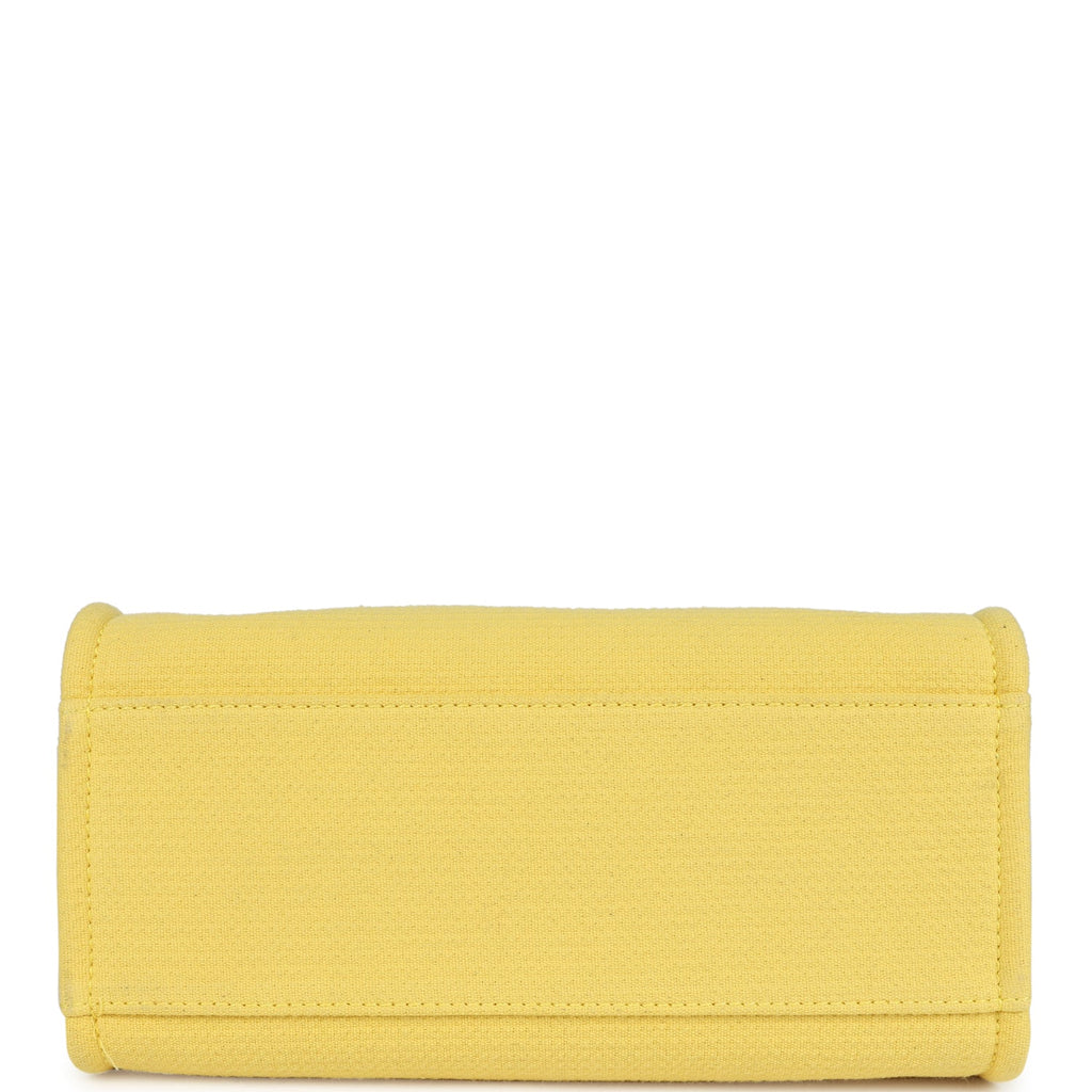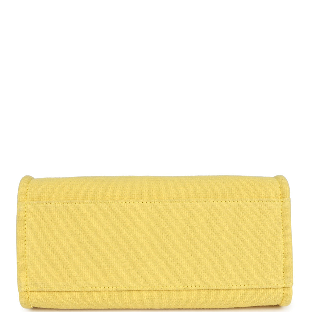 This small Deauville Shopping Tote is in yellow canvas with light gold tone hardware, featuring a large CC signature and Chanel logo on the front, magnetic snap closure, removable pouch and interwoven light gold tone chainlink and Yellow leather shoulder straps and two leather top handles.The interior is lined in beige linen fabric and has two open pockets on the front wall and a zipper pocket with a Chanel pull on the rear wall.Collection: REV (RFID)Origin: ItalyCondition: New and never worn (plastic on hardware)Accompanied by: Chanel dustbag, carebook, RFID, removable pouchMeasurements: 12″ width x 10″ height 5.75″ depth; 3.5″ top handle; 11″ shoulder straps