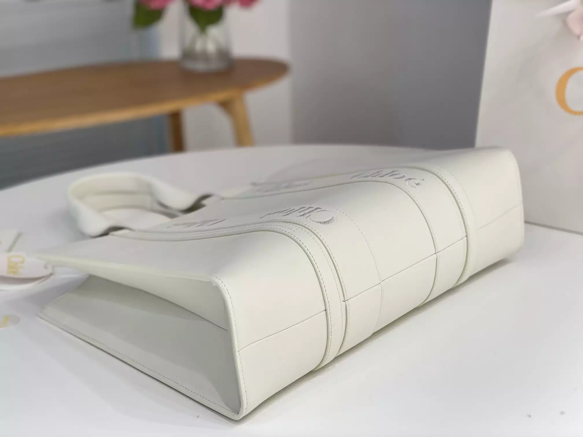 The bag’s modern design features vertical leather strips with contrast stitching, along with the iconic Chloé logo embroidery. Carry it easily on your shoulder for a chic look.