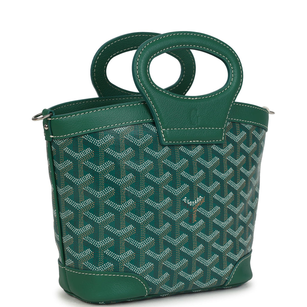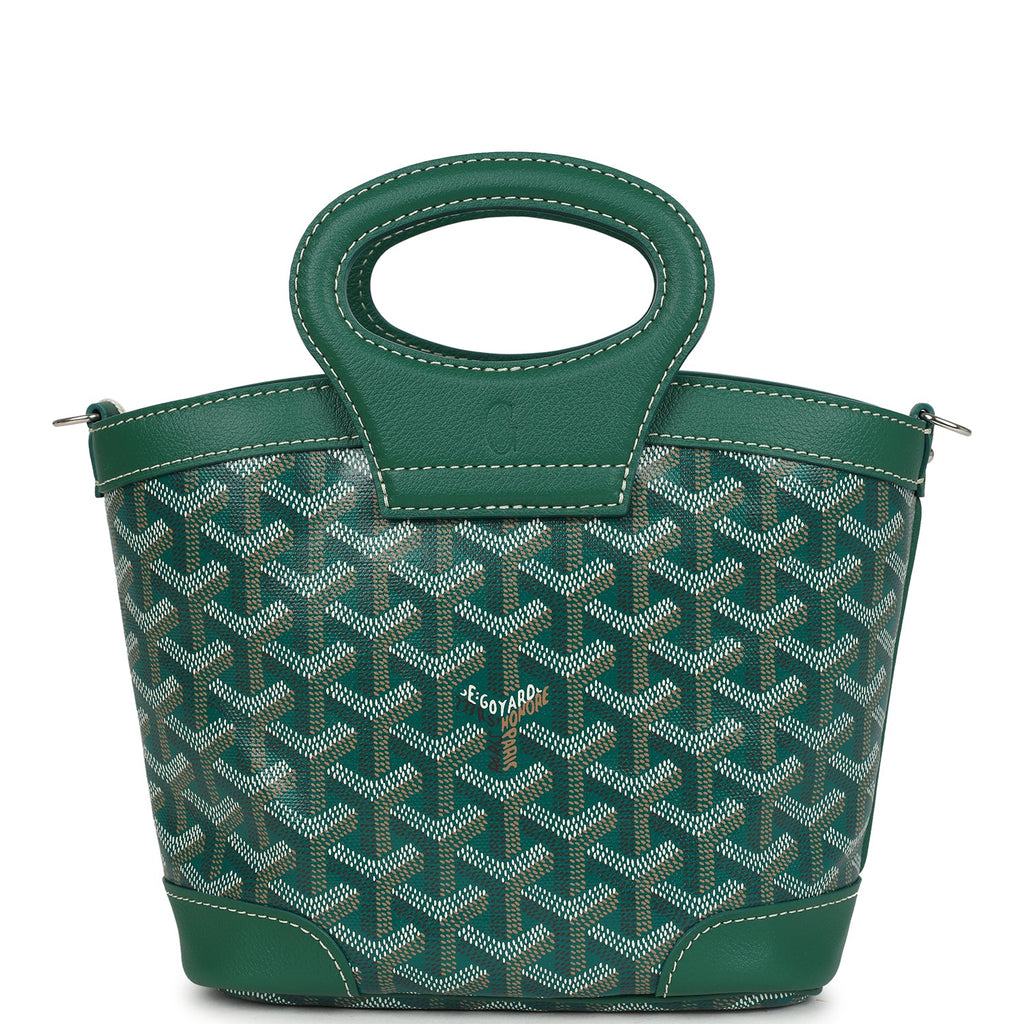 This Goyard Beluga Mini Bag is of green Goyardine coated canvas and Chevroches calfskin leather with palladium hardware, featuring white contrast stitching, green Chevroches calfskin trimming, two top handles, and a detachable, adjustable shoulder strap.The interior is lined with linen and cotton canvas fabric and features an inside pouch with a drawstring closure.Origin: FranceCondition: New and never wornAccompanied by: Goyard box, Goyard dustbag, detachable strap, strap dustbag, carebook, retail tag, ribbonMeasurements: 9.1” x 3.2″ x 7.3″; 1.6″ handle; shoulder strap: 19.3″ – 21.7″