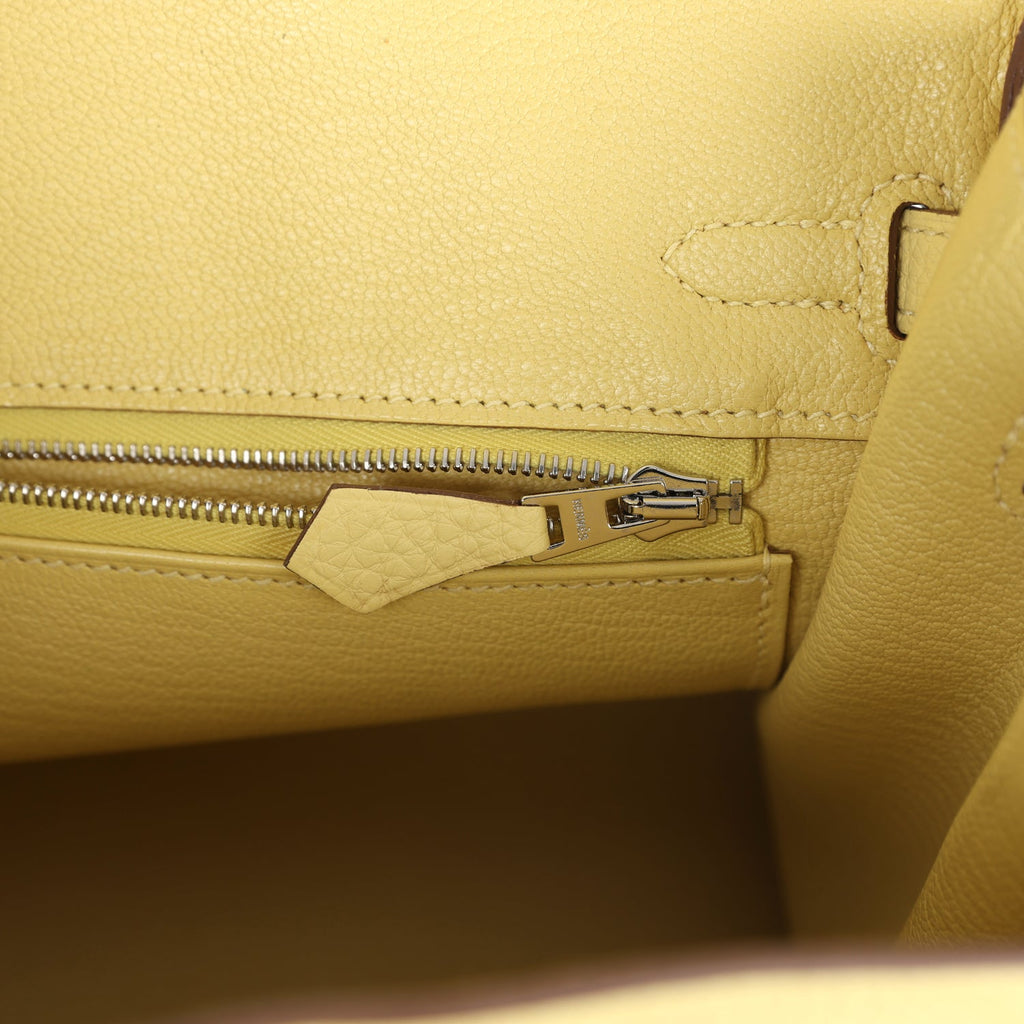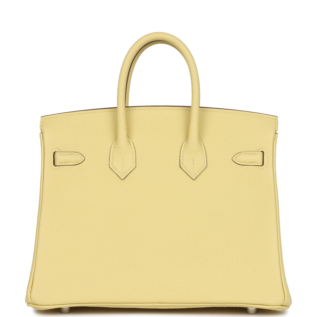 Hermes Birkin 25 Jaune Poussin Togo Palladium Hardware Shop for an authentic Hermes Birkin 25 in Jaune Poussin Togo leather with palladium hardware in new and never worn condition at Madison Avenue Couture.