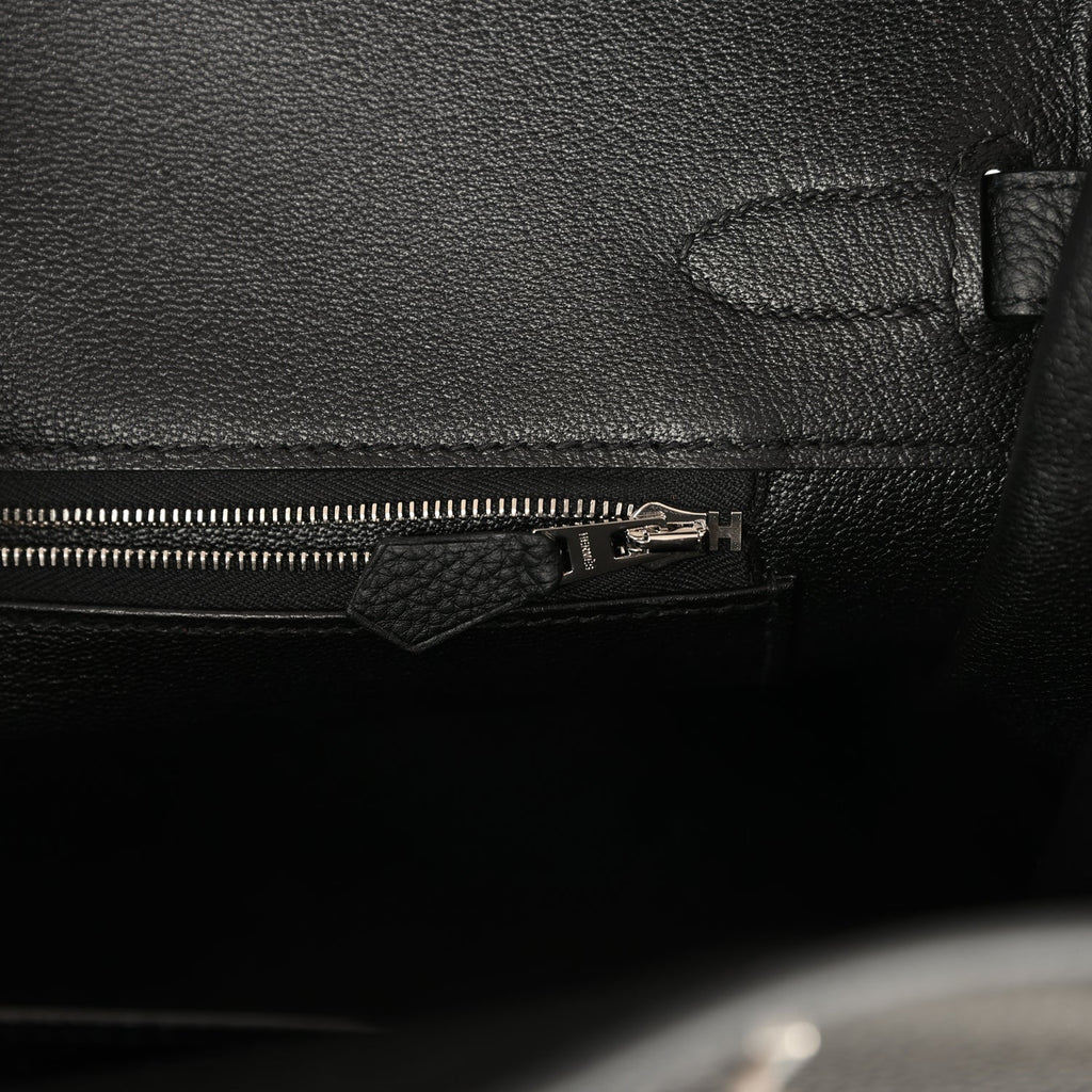 This Birkin is in Black togo leather with brushed palladium hardware and has tonal stitching, front flap, two straps with center toggle closure, clochette with lock and two keys, and double rolled handles.The interior is lined with Black chevre and has one zip pocket with an Hermes engraved zipper pull and an open pocket on the opposite side. Collection: K (2025)Origin: FranceCondition: New and never worn (plastic on hardware)Accompanied by: Hermes box, Hermes dustbag, clochette, clochette dustbag, lock, two keys, felt, carebookMeasurements: 13.75″ width x 11″ height x 7″ depth; 4.25″ handle drop