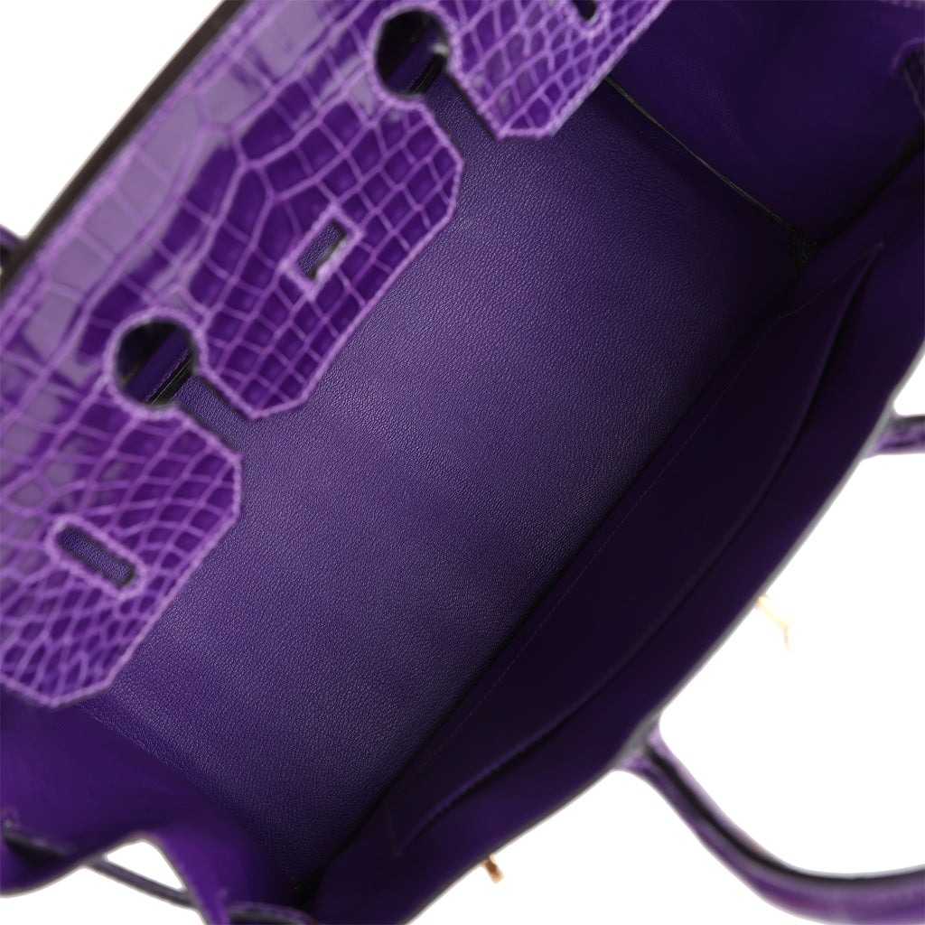 Hermes Birkin 35 Ultraviolet Shiny Porosus Crocodile Gold Hardware Shop for an authentic Hermes Birkin 35 in Ultraviolet Shiny Porosus Crocodile with gold hardware in never worn condition at Madison Avenue Couture.