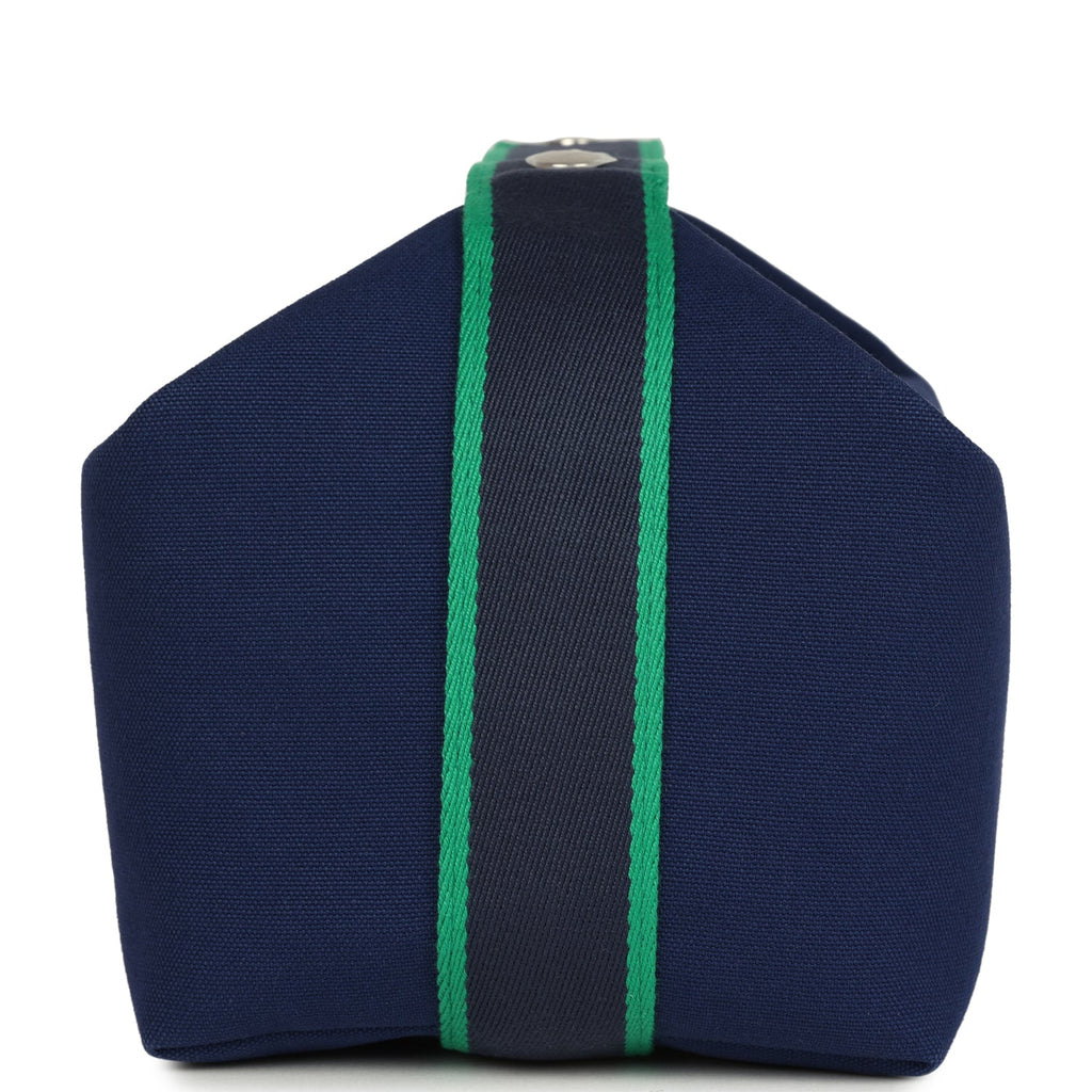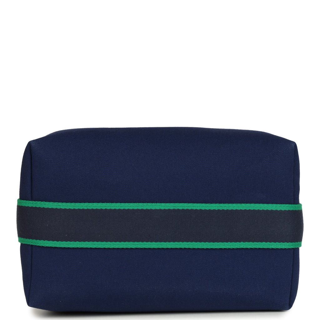 This Bride-A-Brac Case is in Bleu Marine canvas with palladium hardware, features large pouch, anti-stain waterproof lining, embroidered “H” on the front, tonal stitching, zippered closure, snap closure top handle.The interior is lined in beige classic herringbone lining and has three interior pockets.Origin: FranceCondition: New and never wornMeasurements: 9.8″ width x 8″ height x 5.5″ depth; 4″ handle