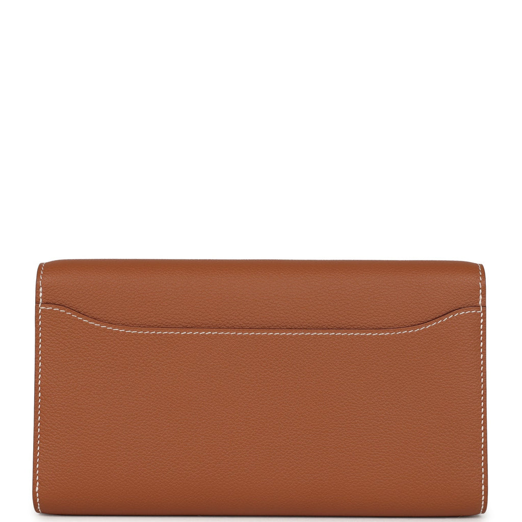 This Constance Wallet To Go is in Gold evercolor leather with palladium hardware and has contrast stitching, metal “H” snap lock closure, open front compartment and removable crossbody strap.The interior is lined with Gold evercolor leather and two main compartments with six credit card slots and a zippered center compartment with Hermes H lock pull.Collection: W (2024)Origin: FranceCondition: New and never worn (plastic on hardware)Accompanied by: Hermes box, strap, strap dustbag, feltMeasurements: 8″ width x 4.5″ width x 1.5″ depth; 20″ strap drop