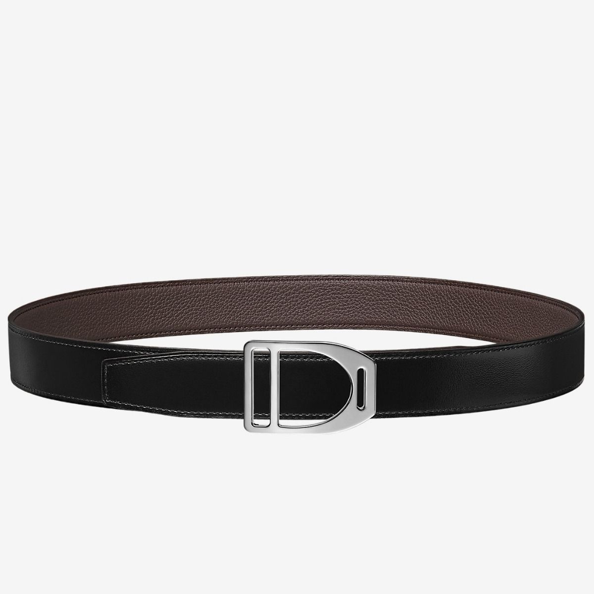 Perfect for men seeking an understated look, this Hermes Etrier buckle belt features reversible leather strap 32 mm in clemence and black box calfskin leather.