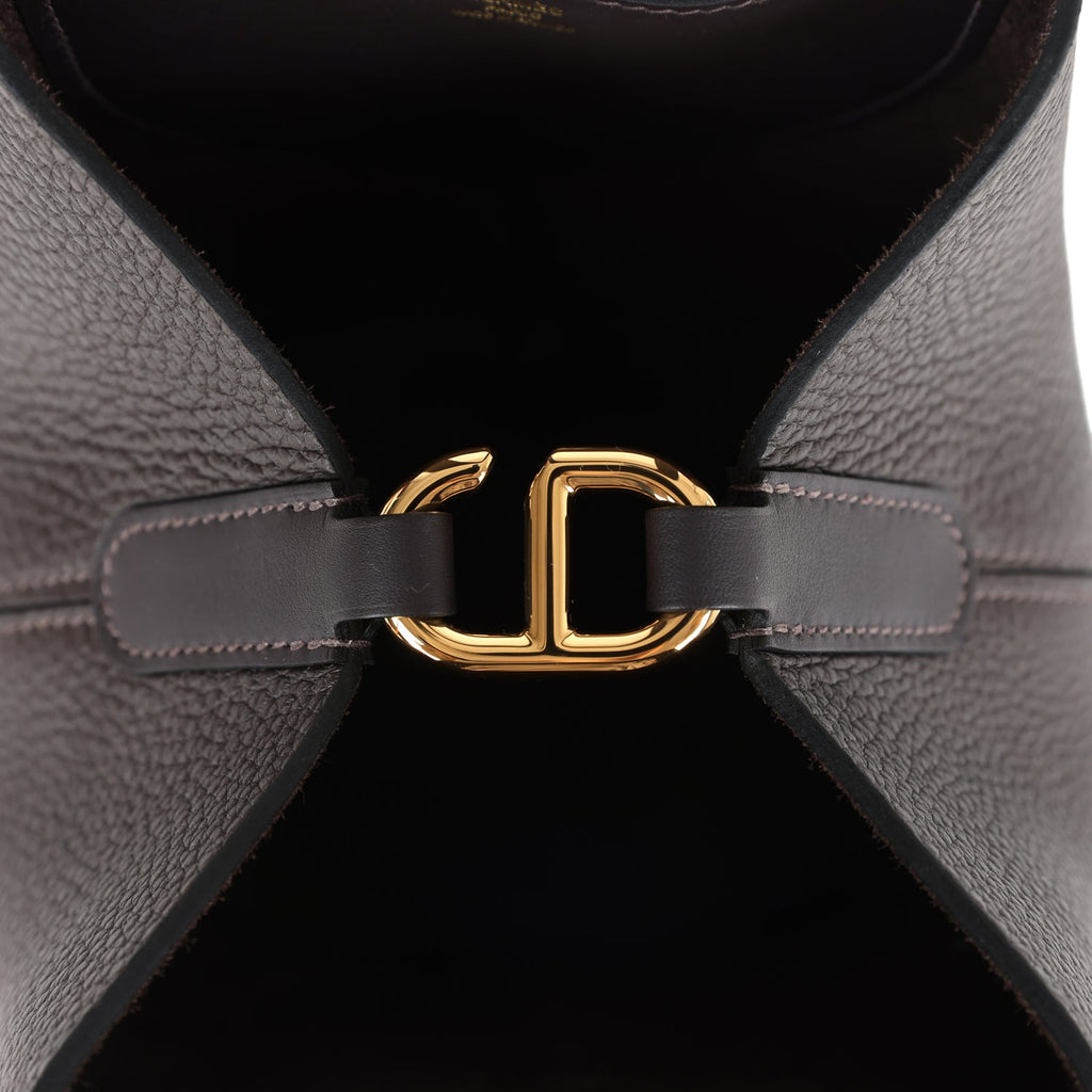 This In-The-Loop is in Ebene clemence and swift leather with gold hardware, bucket shaped bag with tonal stitching, two Chaine d’Ancre shaped handles, single interior pocket, Chaine d’Ancre shaped hook closure.The interior is lined in Ebene natural suede leather and swift leather.Collection: W (2024)Origin: FranceCondition: New and never wornAccompanied by: Hermes box, Hermes dustbag, carebook, ribbonMeasurements: 8.5″ width x 9″ height x 4″ depth; 3.5″ handles