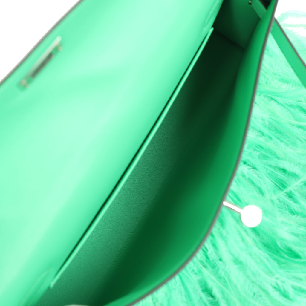 Hermes Kelly Elan Foile Vert Comics Chevre and Ostrich Feather Palladium Hardware Shop for an authentic Hermes Kelly Elan Foile in Vert Comics with palladium hardware in new and never worn condition at Madison Avenue Couture.
