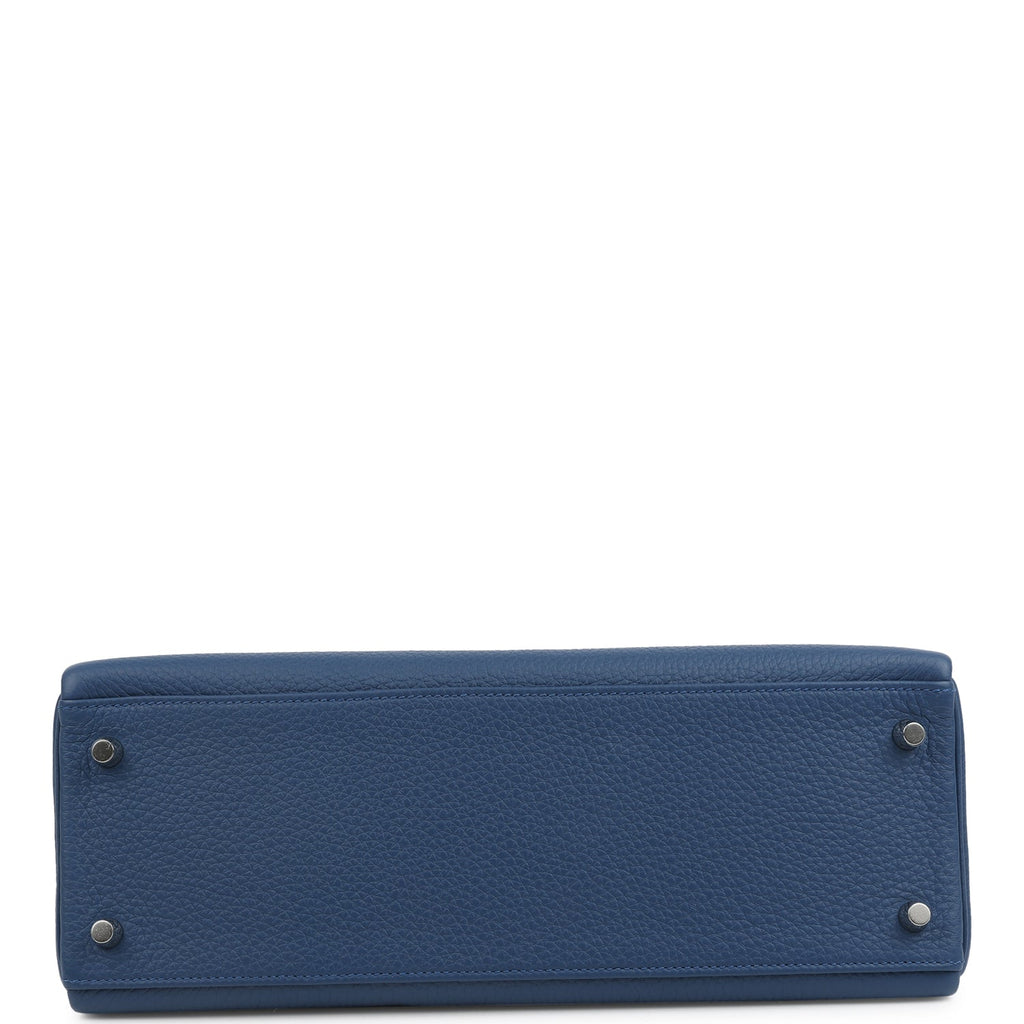 Hermes Kelly Retourne 32 Bleu Tie Clemence Palladium Hardware Shop for an authentic Hermes Kelly Retourne 32 in Bleu Tie clemence leather with palladium hardware in new and never worn condition at Madison Avenue Couture.