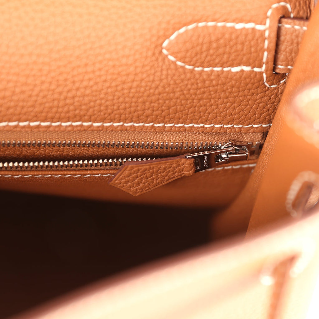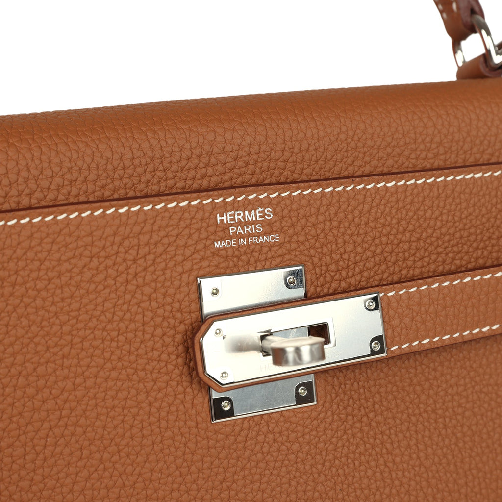 Hermes Kelly Retourne 32 Gold Togo Palladium Hardware Shop for an authentic Hermes Kelly 32 in Gold togo leather with palladium hardware in new and never worn condition at Madison Avenue Couture.