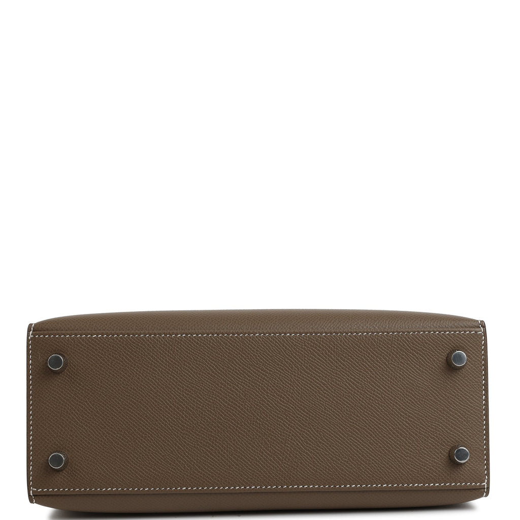 Hermes Kelly Sellier 25 Etoupe Epsom Palladium Hardware Shop for an authentic Hermes Kelly Sellier 25 in Etoupe Epsom leather with palladium hardware in new and never worn condition at Madison Avenue Couture.