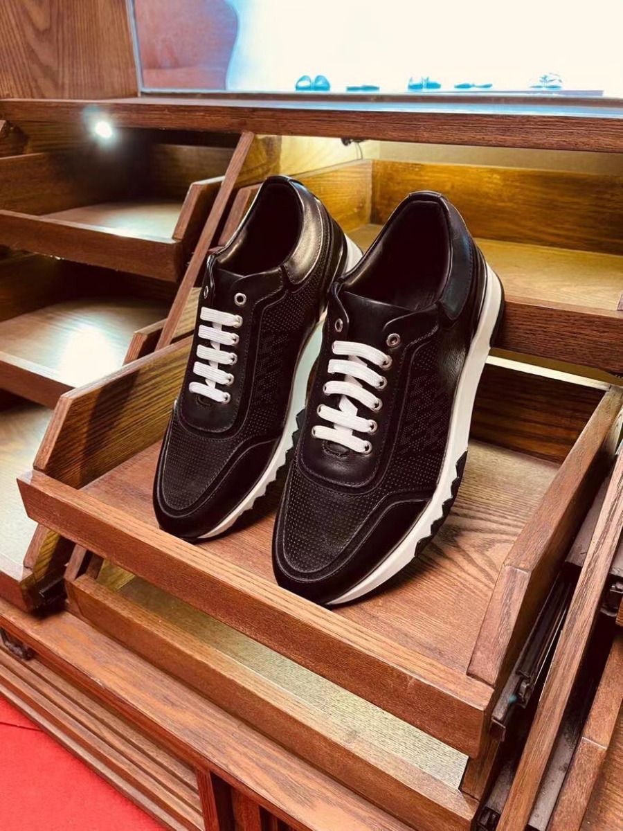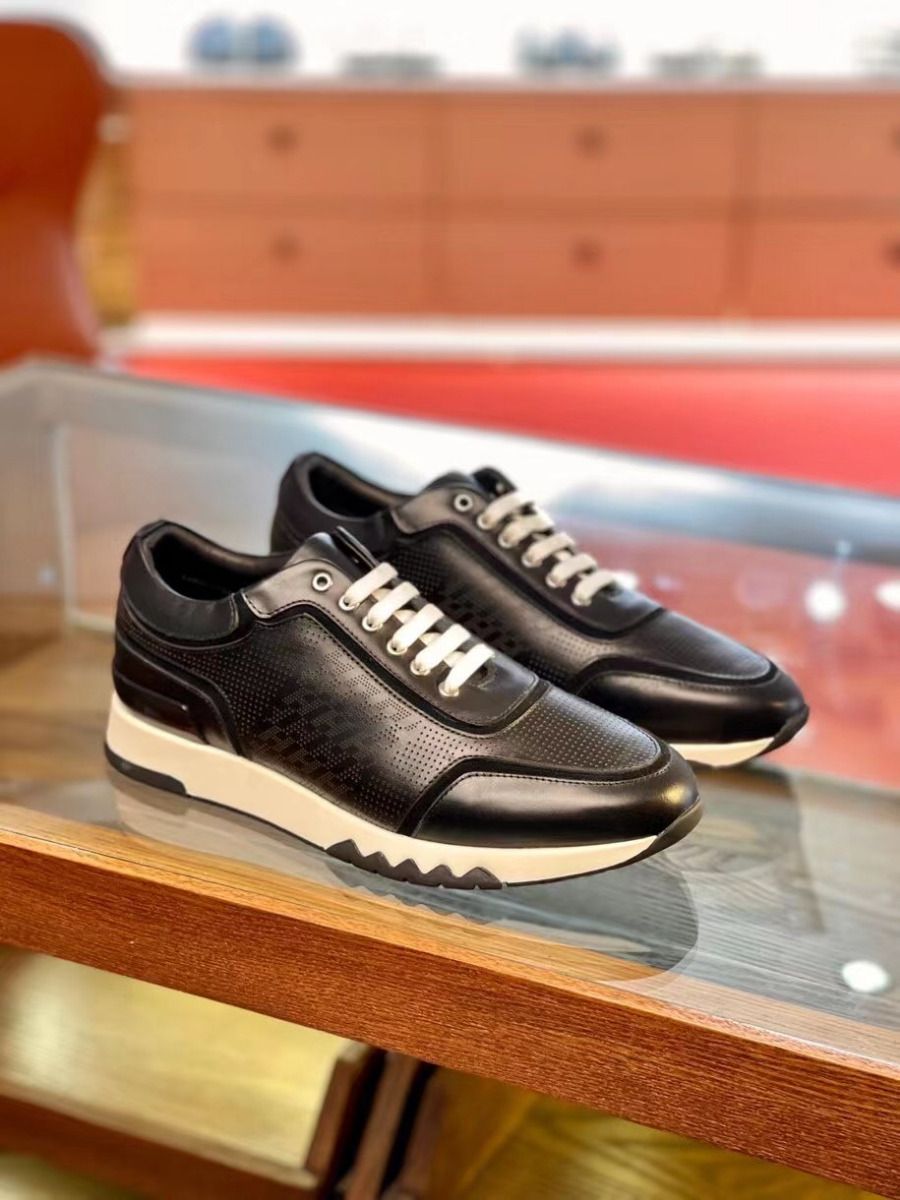 Hermes C-Addict Sneaker in perforated calfskin with “H en Biais” motif. For an elegant and modern look, this pair features black zigzag rubber insert on the front and black rubber insert on the back.