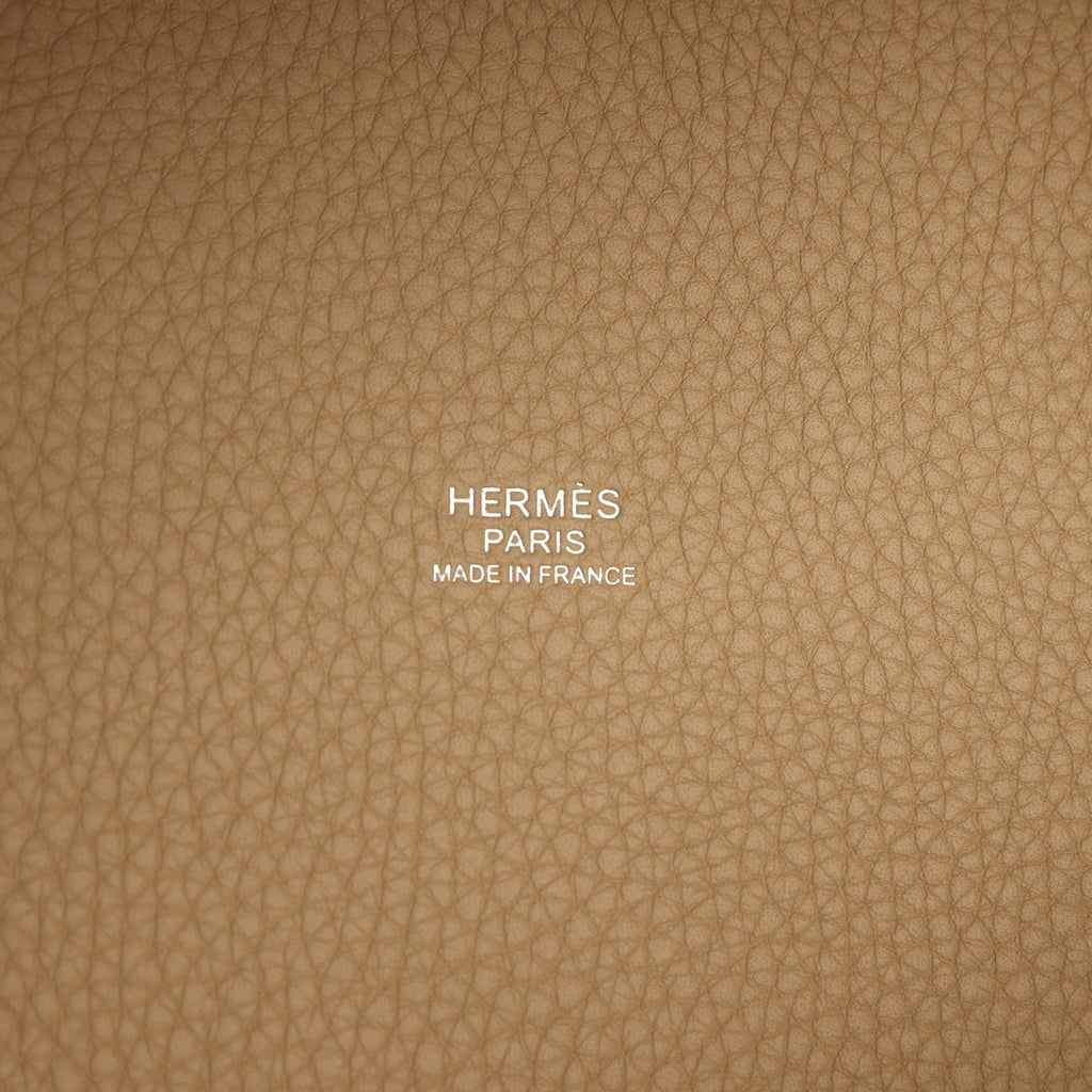 This Picotin Lock is in Trench clemence leather with palladium hardware and has tonal stitching with two top handles.The interior is lined with Trench natural leather, no interior pockets and has a pull through closure secured by padlock.Collection: K (2025)Origin: FranceCondition: New and never worn (plastic on hardware)Accompanied by: Hermes box, Hermes dustbag, lock, two keys, lock and key dustbag, carebookMeasurements: 7″ width x 7.5″ height x 5.5″ depth; 5.5″ handles
