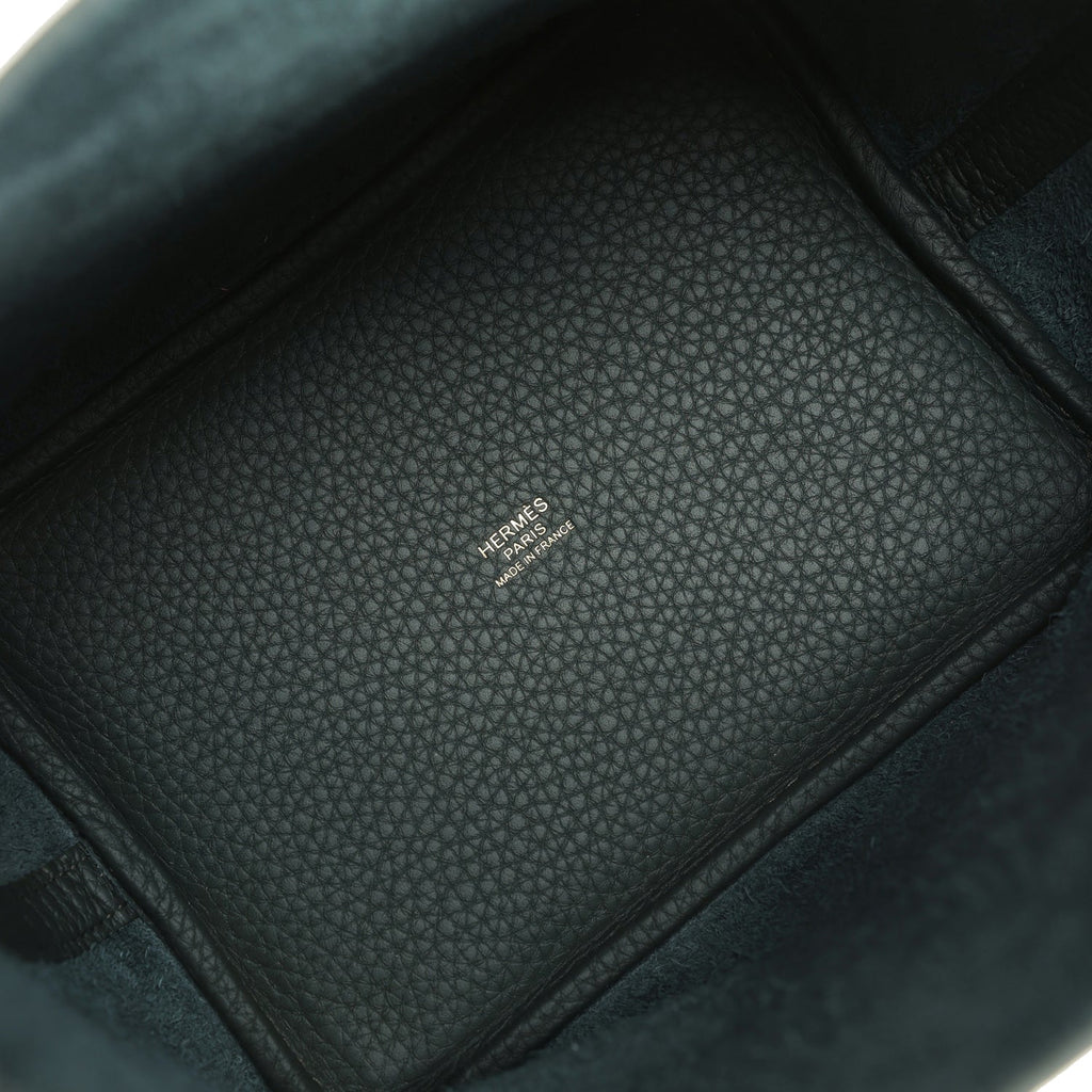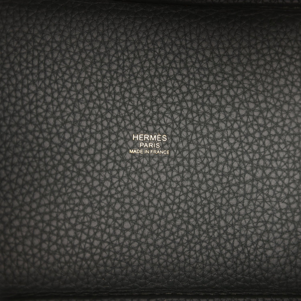 The interior is lined with Vert Mangrove natural suede leather, no interior pockets and has a pull through closure secured by padlock.Collection: K (2025)Origin: FranceCondition: New and never worn (plastic on hardware)Accompanied by: Hermes box, Hermes dustbag, lock, keys, lock and key dustbag, carebook and ribbonMeasurements: 7″ width x 7.5″ height x 5.5″ depth; 5.5″ handles