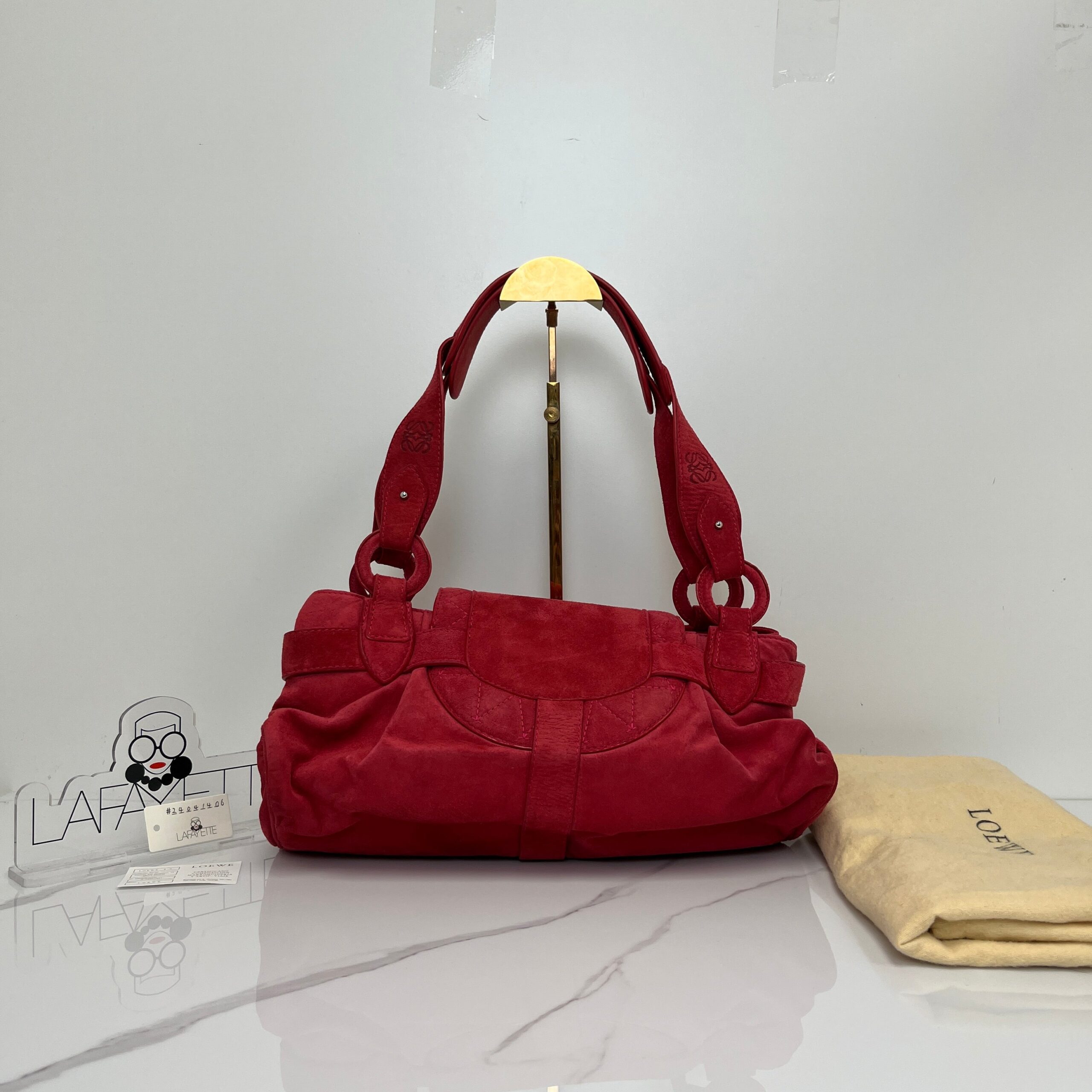 Add a splash of color to your wardrobe with the Loewe Vintage Shoulder Bag in vibrant red suede. This bag combines timeless elegance with a bold hue, making it the perfect accessory for any outfit that needs a standout touch.