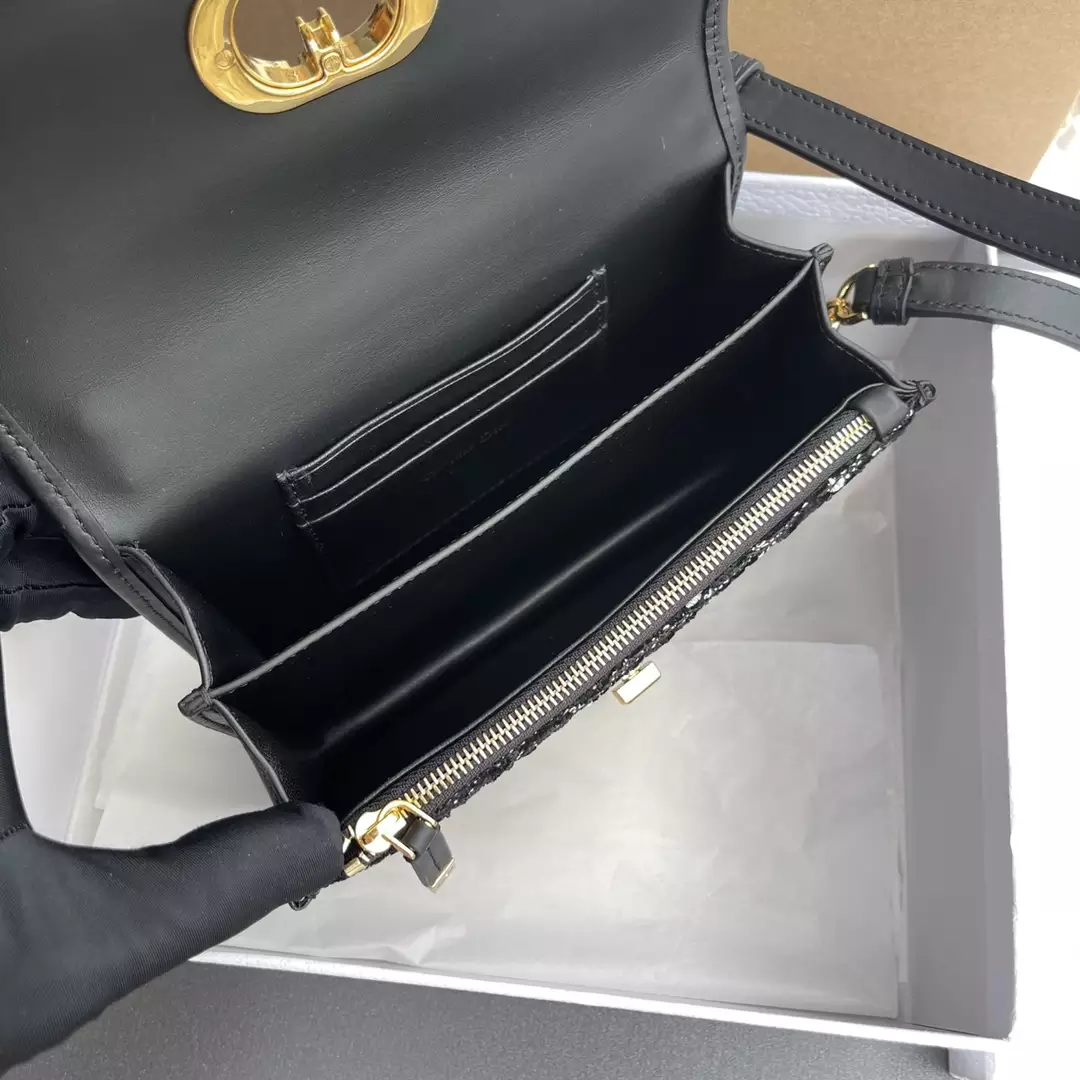 Made with black tweed-effect embroidery, it features the Cannage pattern and a gold CD twist clasp.
