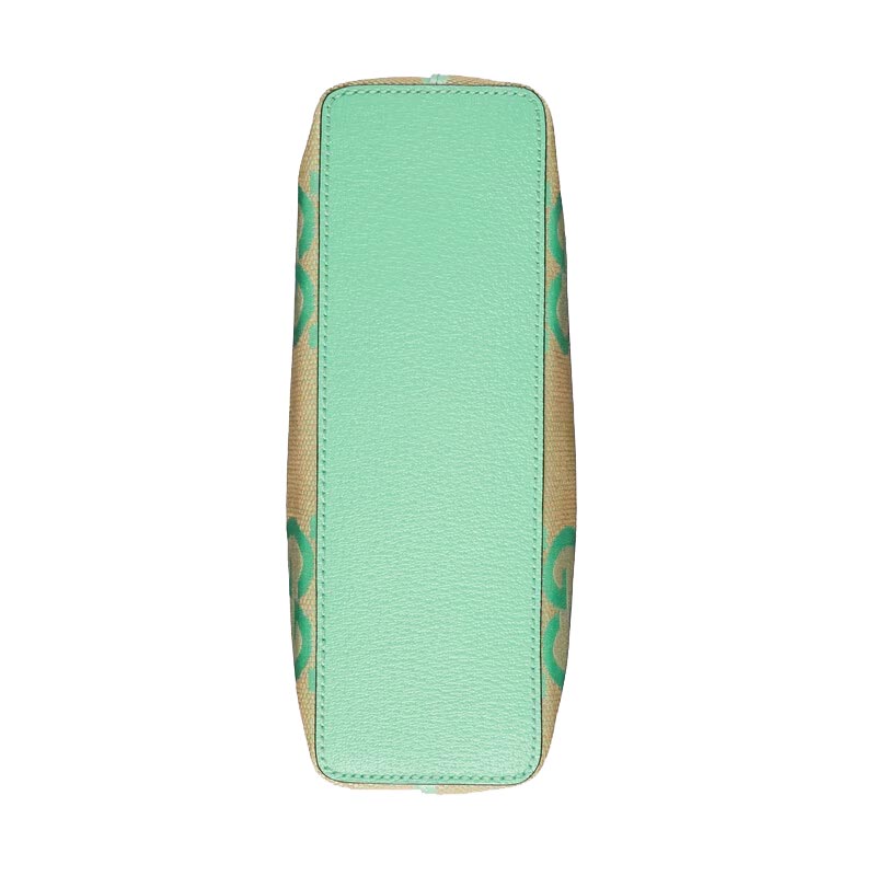 Exploring a new maximalist version of the historic monogram, the jumbo GG animates this small shoulder bag in camel and mint, creating striking look.