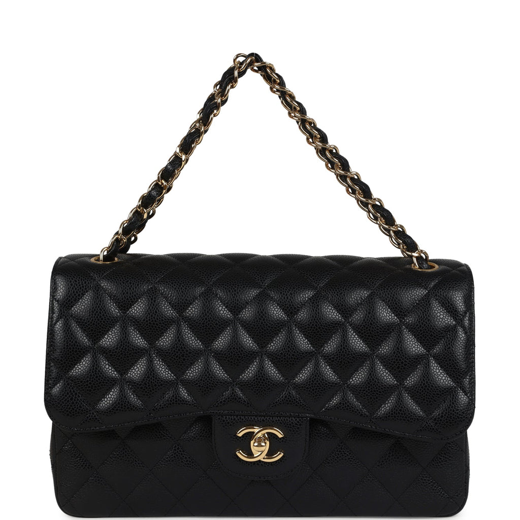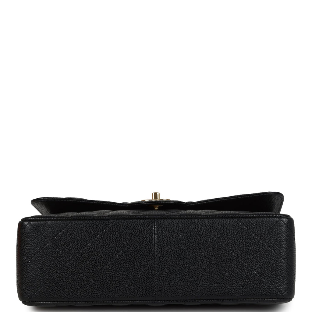 Pre-owned Chanel Jumbo Classic Double Flap Bag Black Caviar Gold Hardware Shop for an authentic pre-owned Chanel Jumbo Double Flap in black caviar leather with gold tone hardware in mint condition at Madison Avenue Couture.