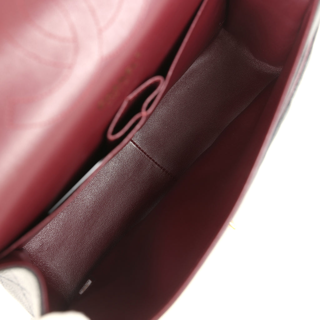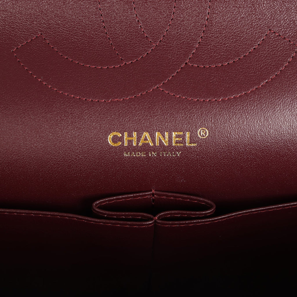 This Jumbo Classic Double Flap bag is in black caviar leather with gold tone hardware and features a front flap with signature CC turnlock closure, half moon back pocket, and adjustable interwoven gold tone chainlink and black leather shoulder strap.The interior is lined in burgundy leather with a “love letter” zipper compartment under the first flap, an “outer” slit pocket under the second flap, and an interior compartment with two open pockets separated by a “lipstick” compartment.Collection: 29-Series (2019-2020)Origin: FranceCondition: Pre-owned; Mint – This bag retains its shape structure. The exterior leather is clean overall with no signs of wear or use. There is no plastic on the hardware. There are very light hairline scratches to the cc turnlock closure. The interior leather is clean overall with the exception of a few minor press marks/indents to the interior flap from the shoulder strap and zipper.Accompanied by: MAC dustbag, COA cardMeasurements: 12″ width x 8″ height x 3.5″ depth; 23″ strap drop: 23″ (13″ doubled)
