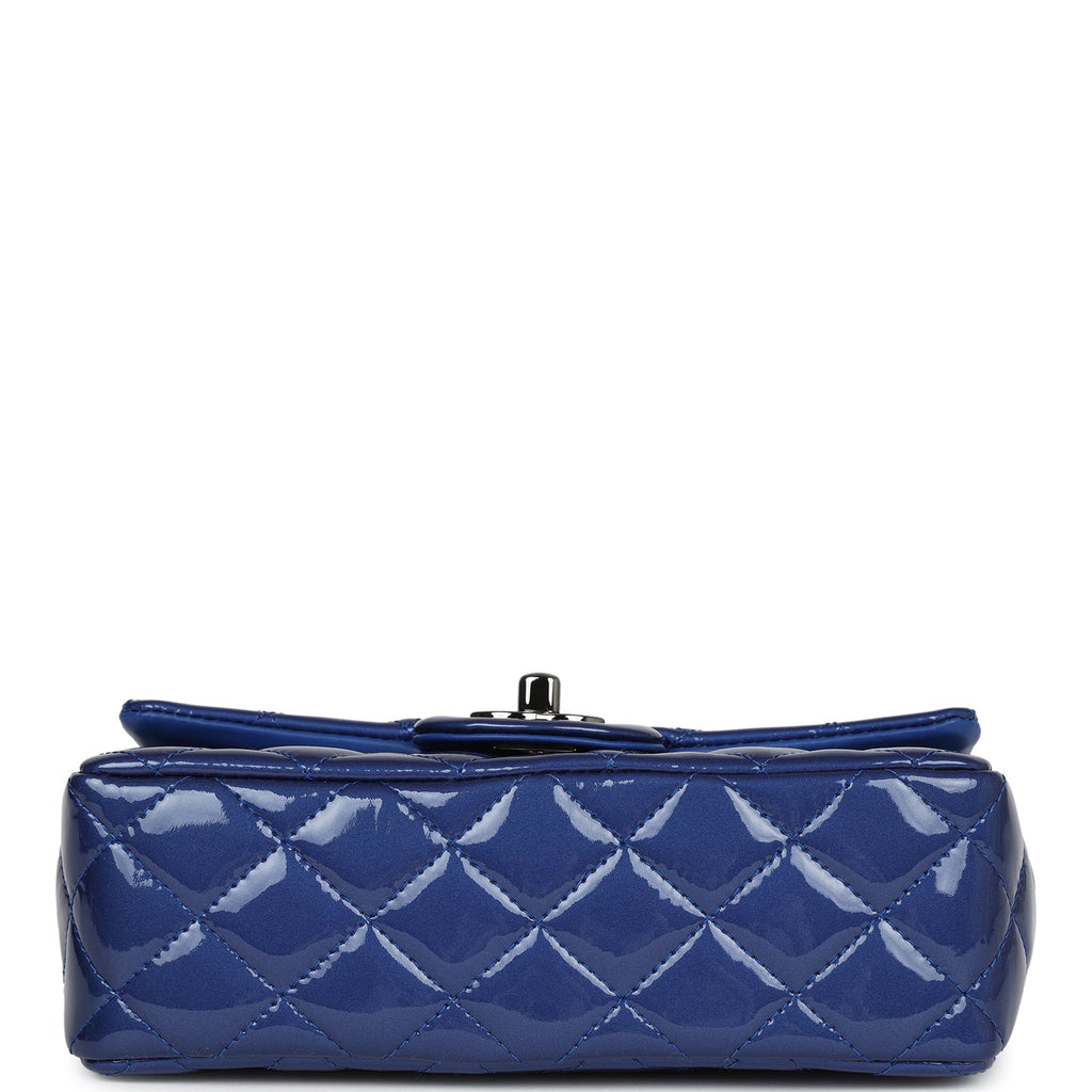 Pre-owned Chanel Mini Rectangular Flap Bag Blue Patent Ruthenium Hardware Shop for an authentic pre-owned Chanel Mini Rectangular Flap in blue patent leather with ruthenium tone hardware in mint condition at Madison Avenue Couture.