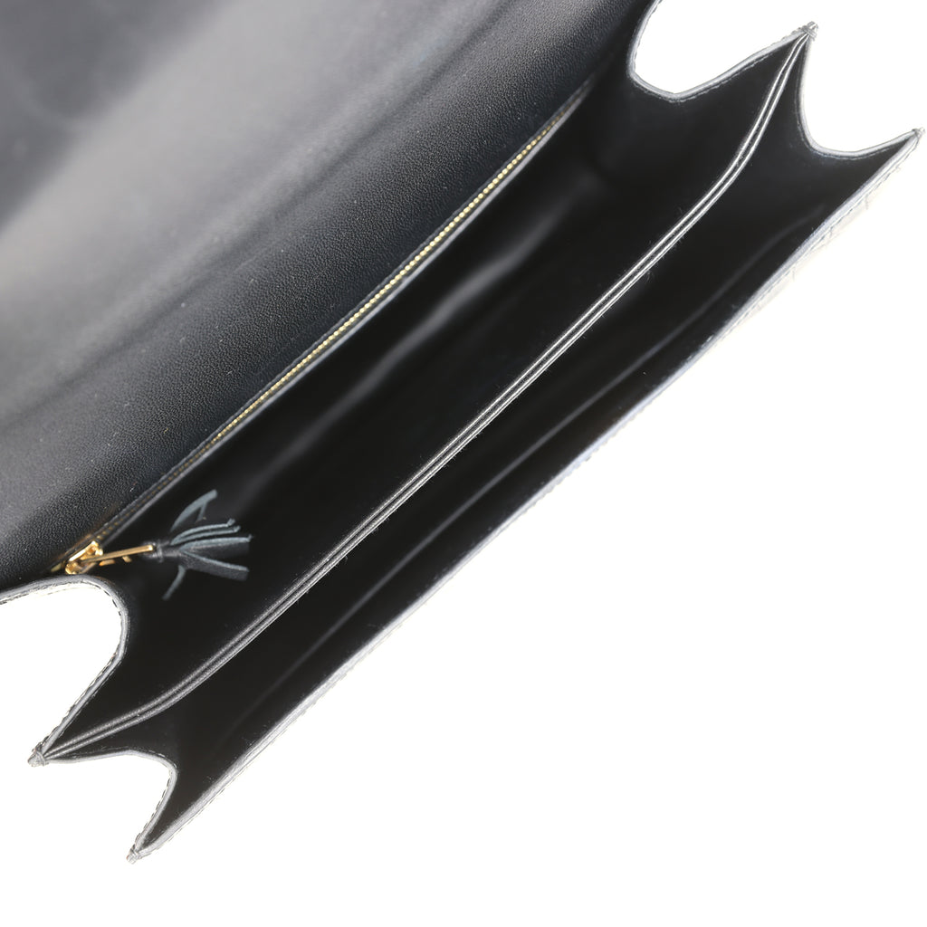 This Constance, is in Black Shiny Niloticus Crocodile leather with gold hardware and features tonal stitching, a “H” snap lock closure, back exterior pocket, and an adjustable shoulder strap.The interior is lined with Black lambskin and has two main compartment, one slip pocket on front wall, and one zip pocket on rear wall.Collection: R Square (2014)Origin: FranceCondition: Pre-owned; Excellent – This bag retains its shape structure. There is no plastic on the hardware. There are moderate scratches to the exposed hardware. The exterior leather has noticeable creasing and scratches to the crocodile skin. The back of the back has a few small water spots. The edge paint has some minor cracking/peeling on the bottom. The interior leather has noticeable wear with creasing and some staining to the interior.Accompanied by: Hermes box, Hermes dustbag, felt, CITESMeasurements: 9″ width x 7″ height x 3″ depth; 18″ adjustable shoulder strap (9″ doubled)
