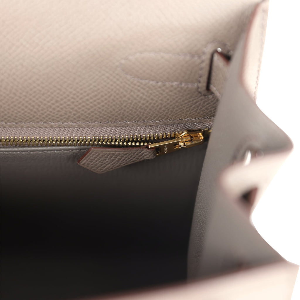 ThisKelly, in the Sellier style, is in Etain epsom leather with gold hardware and has tonal stitching, a front flap, two straps with center toggle closure, clochette with lock and two keys, single rolled handle and removable shoulder strap.The interior is lined in Etain chevre and has one zip pocket with Hermes engraved pull and two open pockets on the opposite side.Collection: Z (2021)Origin: FranceCondition: Pre-owned; Mint – This bag retains its shape. There is plastic on all the hardware except the turnlock, resulting in hairline scratches to the turnlock. The exterior leather is mostly clean with the exception of a tiny scuff to the center bottom edge of the front. The interior leather is clean with no signs of wear.Accompanied by: Hermes box, Hermes dustbag, clochette, lock, two keys, clochette dustbag, strap, strap dustbag, felt, carebook, rainhatMeasurements: 11.25″ width x 8.25″ height x 4.75″ depth; 3.5″ handle drop (16.5″ shoulder strap drop)