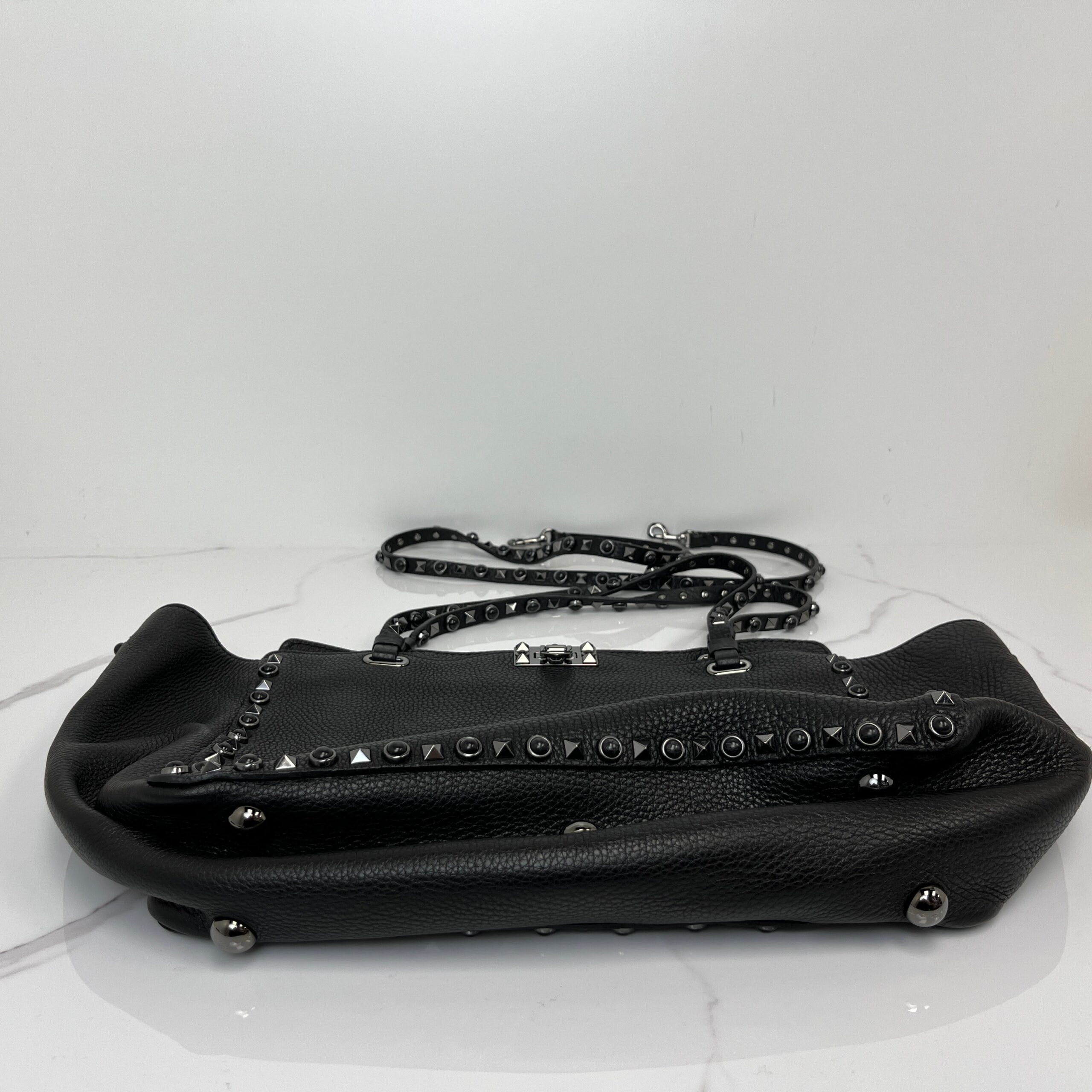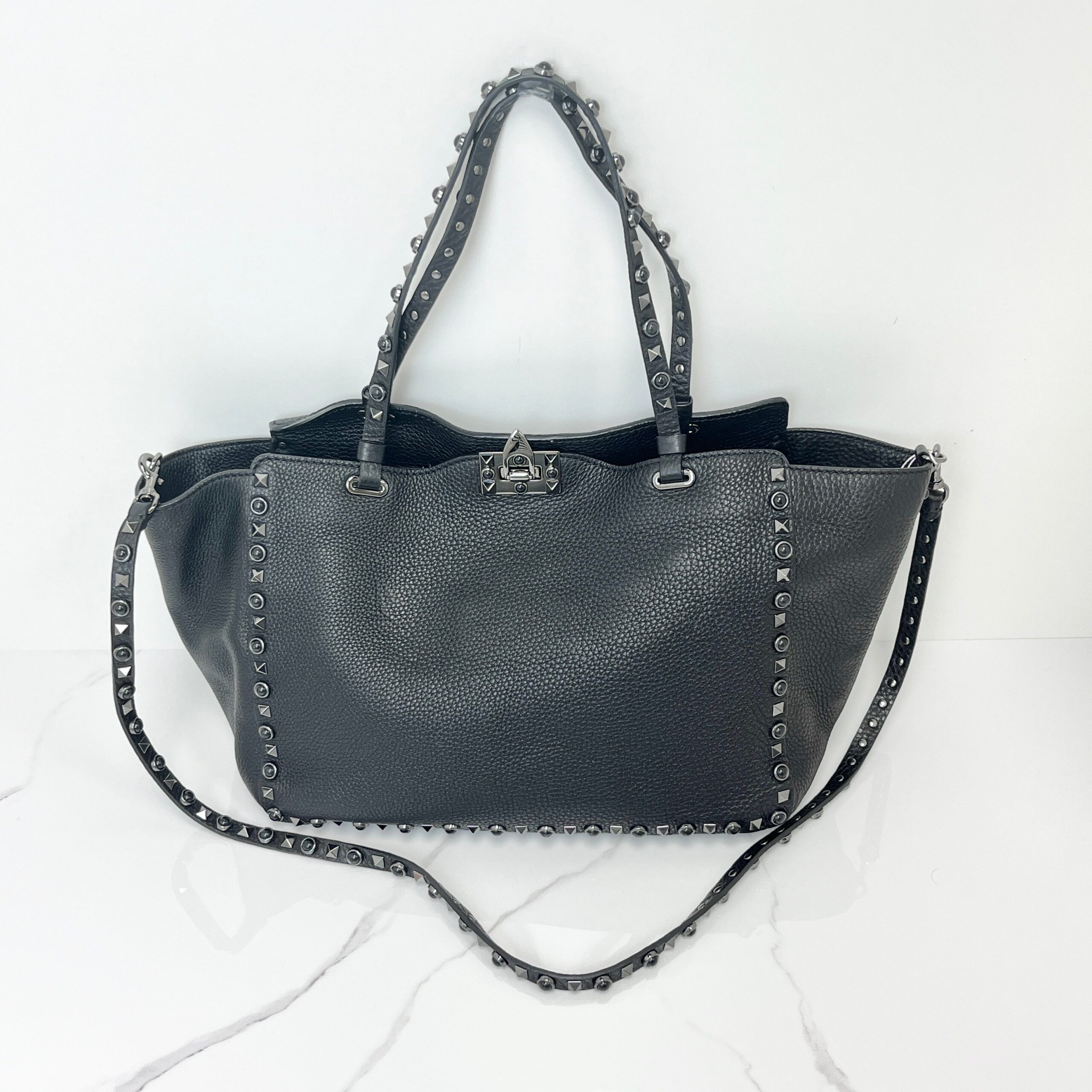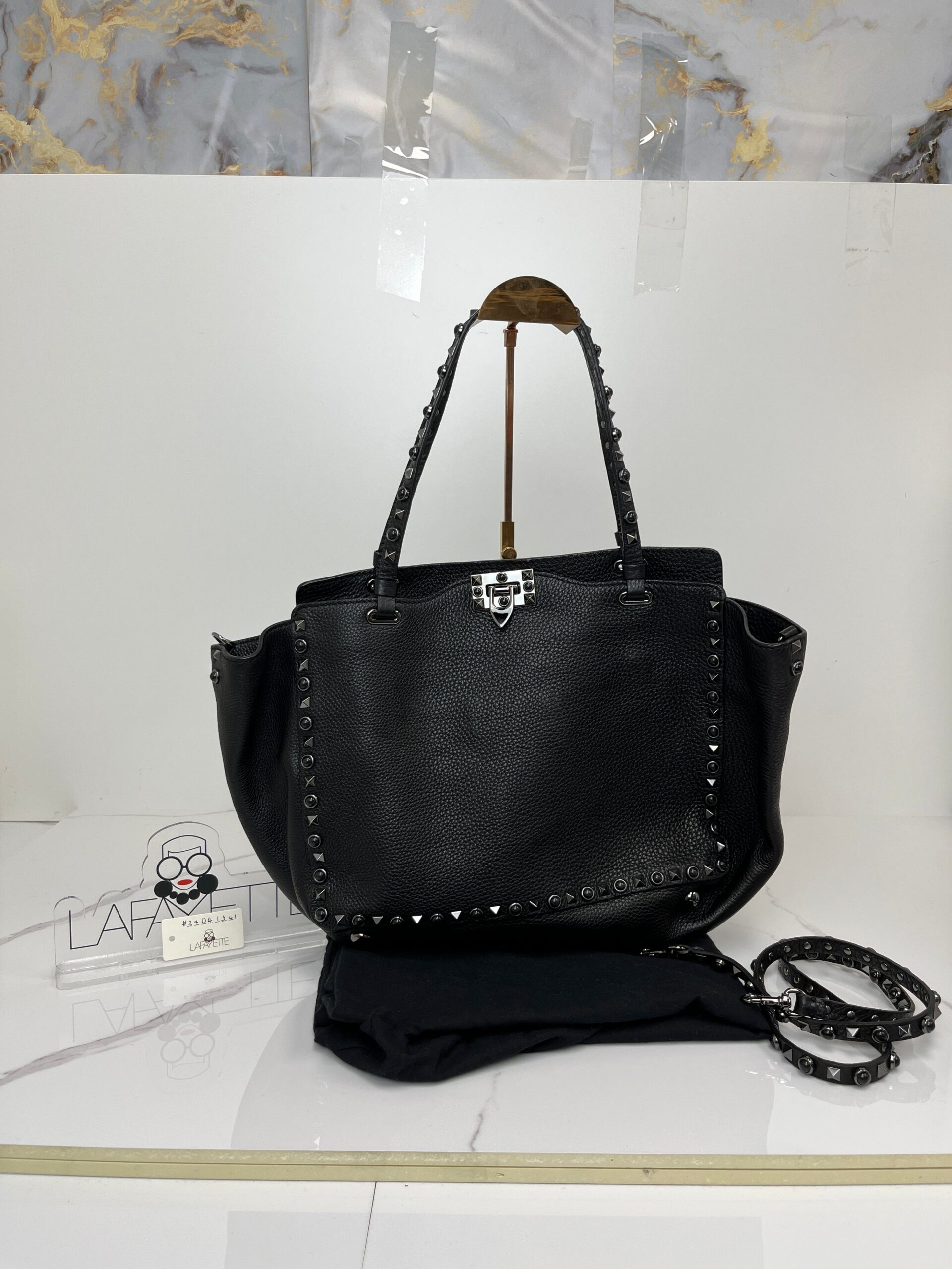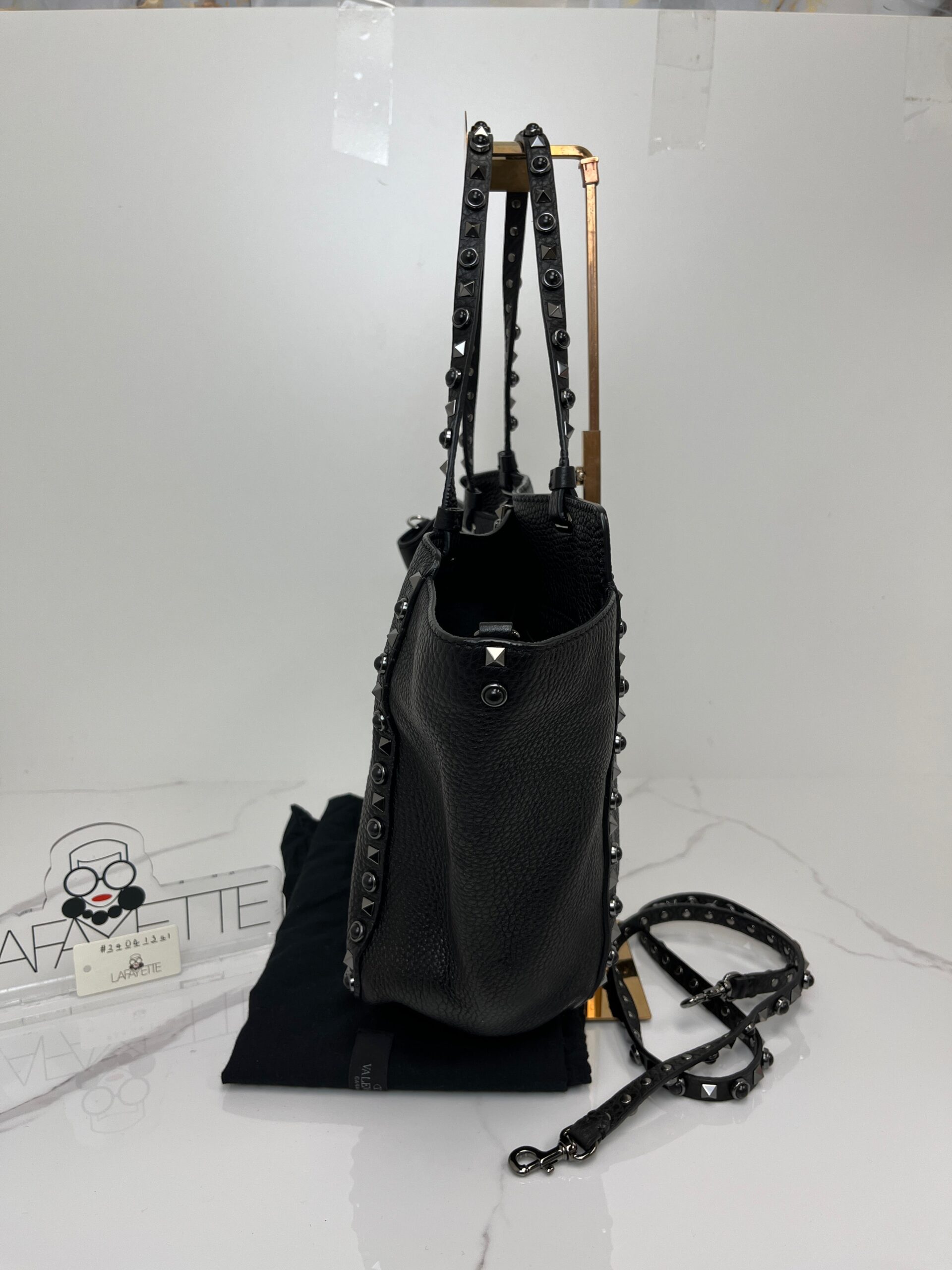 Experience the perfect blend of boldness and beauty with the Valentino Rockstud Tote. Crafted from premium black grainy calfskin and adorned with signature studs, this bag is not just a carry-all—it’s a showstopper. Embrace your fearless side with every carry.