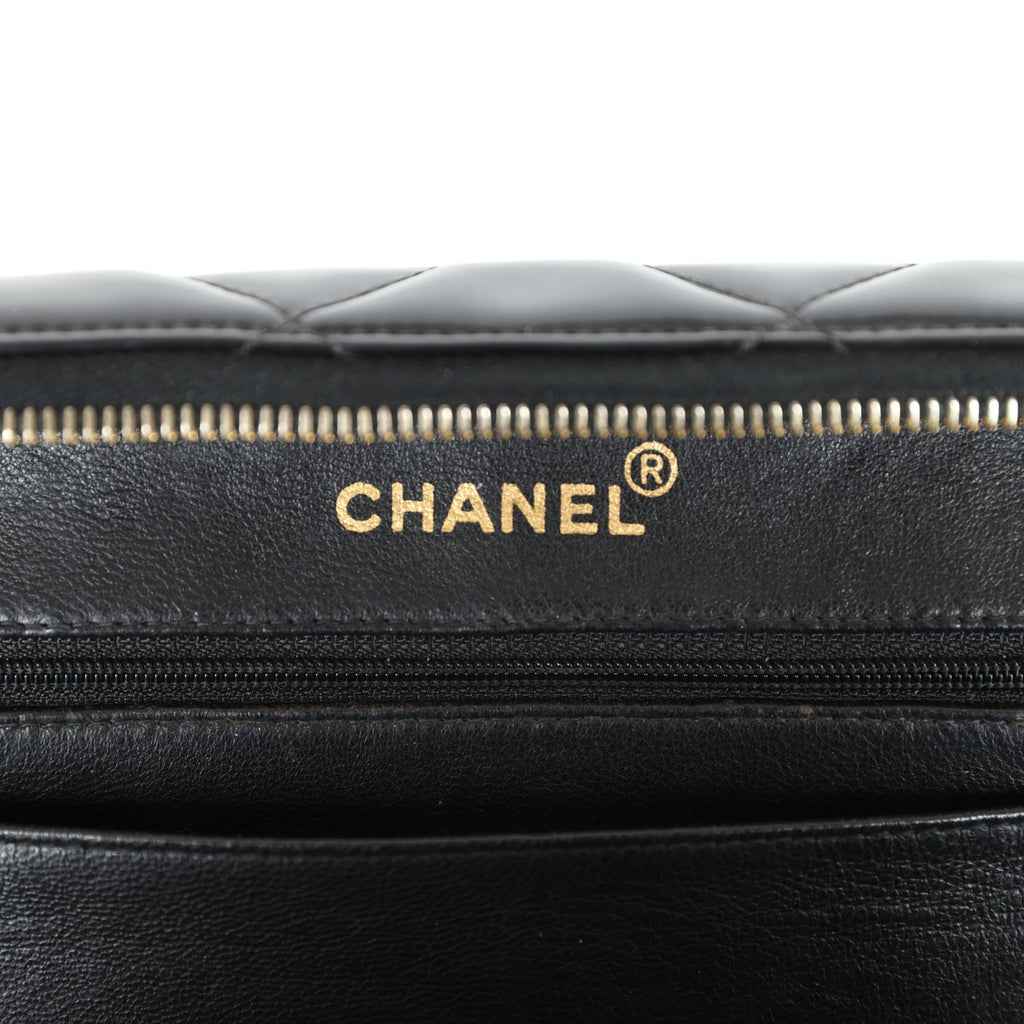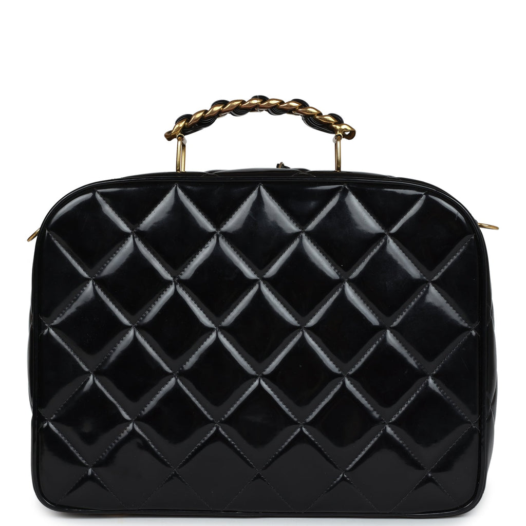 This Vintage Vanity Case Bag is in Black quilted patent leather with gold hardware, a zip around closure, an interwoven leather and gold plated chain link top handle, and a detachable interwoven Black leather and gold plated chain link shoulder strap.The interior is lined with Black patent leather and has one zip pocket with a CC logo pull and an open slip pocket underneath on the back wall.Collection: 3-series (1994-1996)Origin: FranceCondition: Vintage; Very Good – Wear on exterior patent leather, no plastic on hardware. Minor signs of wear on interior. Strong odor inside of bag.Accompanied by: Chanel dustbag and strapMeasurements:  9.4″ width x 7.5″ height x 3.9″ depth; 23″ shoulder strap, 2″ handle drop