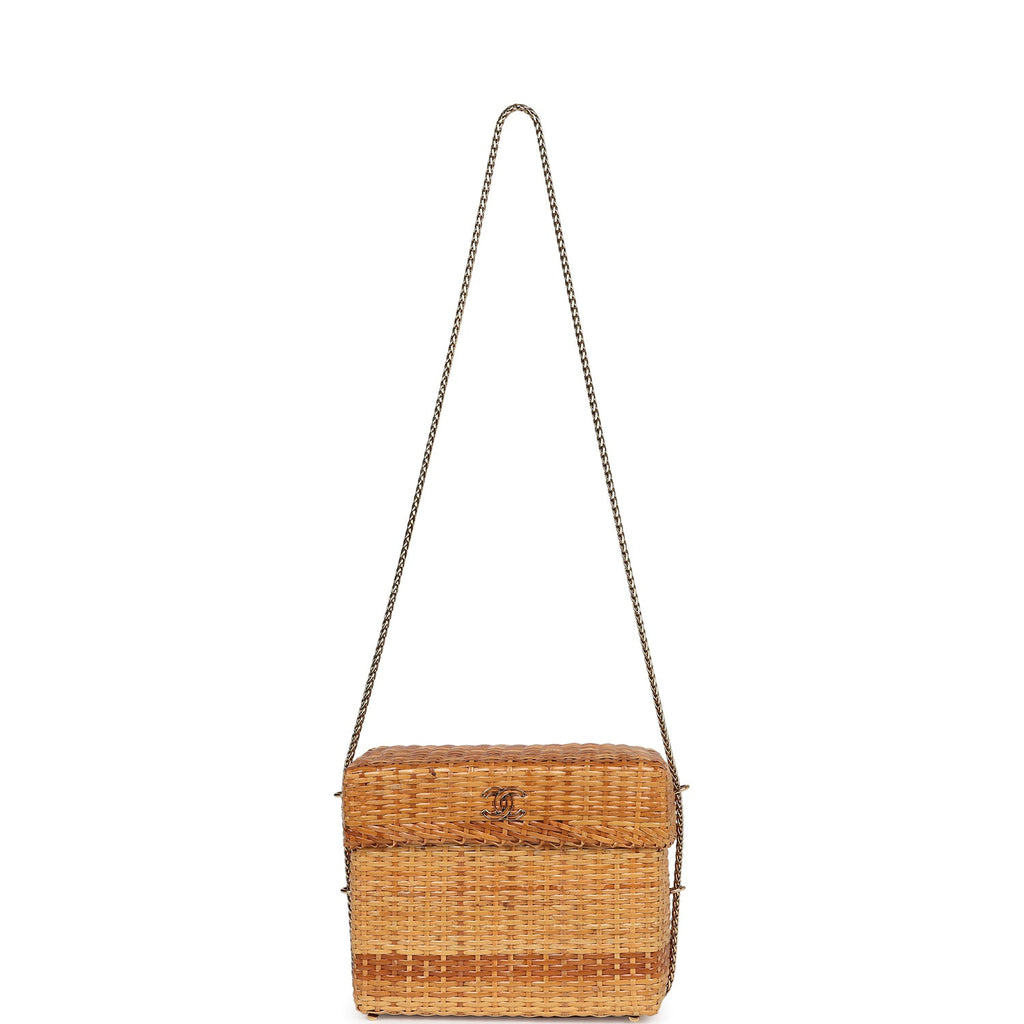 Vintage Chanel Small Picnic Basket Bag Natural Wicker Gold Hardware Shop for an authentic vintage Chanel picnic basket shoulder bag is in natural woven rattan wicker with gold hardware in excellent condition at Madison Avenue Couture.