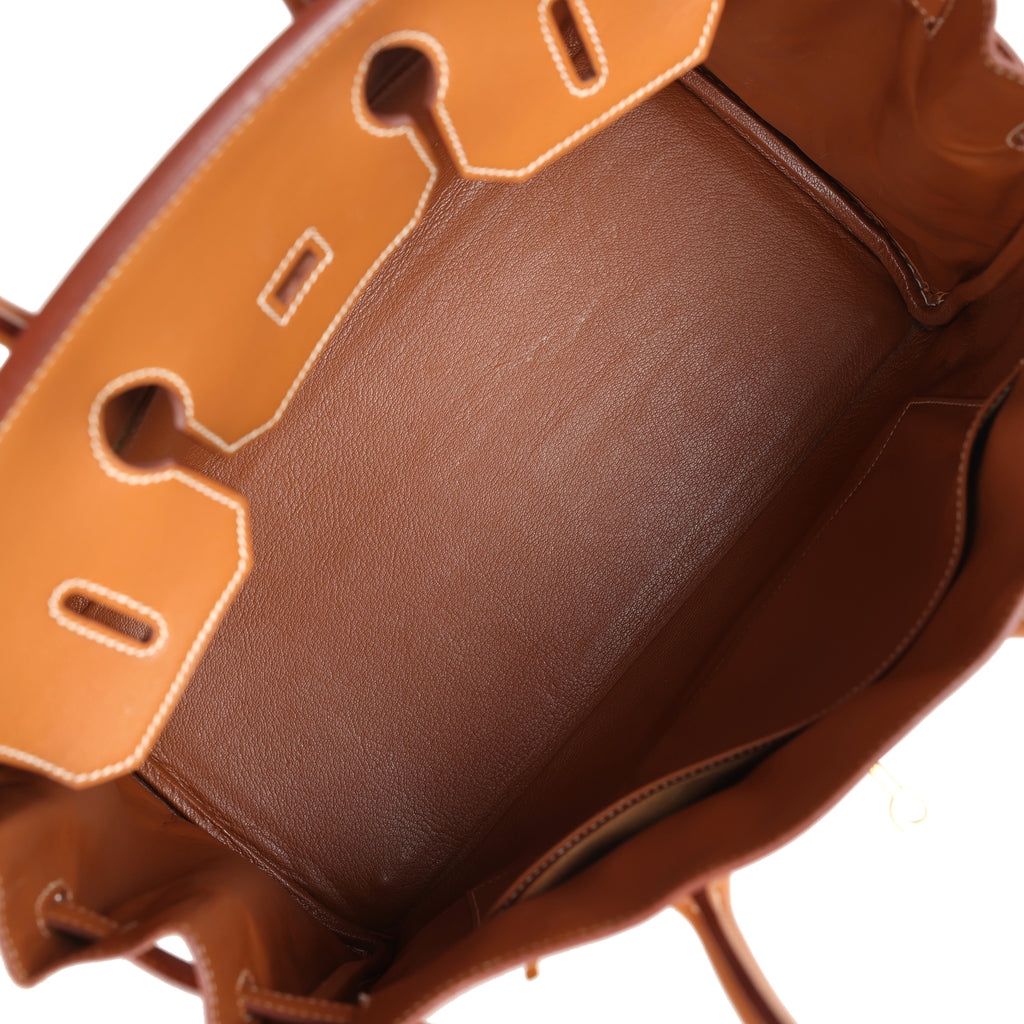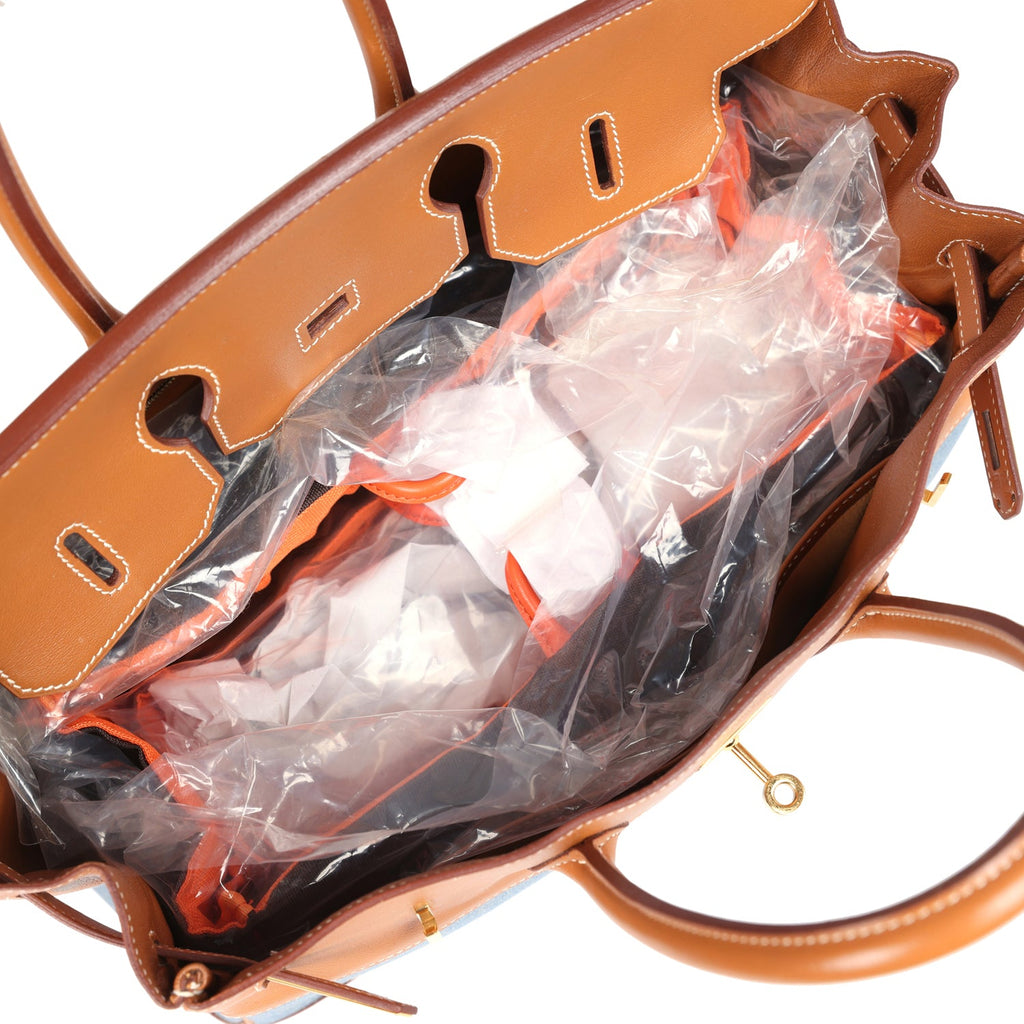 This vintage Birkin is in Blue denim and Gold Gulliver leather with gold hardware and has contrast stitching, front flap, two straps with center toggle closure, clochette with lock and two keys, and double rolled handles.The interior is lined with Gold chevre and has one zip pocket with an Hermes engraved zipper pull and an open pocket on the opposite side.Collection: B Square (1998)Origin: FranceCondition: Vintage; Excellent – This bag is retains its shape structure. There is no plastic on the hardware, resulting in scratching to the exposed hardware. The feet in particular show noticeable wear and discoloration. The exterior leather shows signs of wear with rubbing to the corners, light press marks on the bottom of the front handle, and two tiny stains to the denim on the right wall and the bottom base. The interior leather has moderate creasing and a scuffs and press marks to the interior base.Accompanied by: Hermes dustbag, clochette, lock, one key, clochette dustbag, feltMeasurements: 13.75″ width x 11″ height x 7″ depth; 4.25″ handle drop